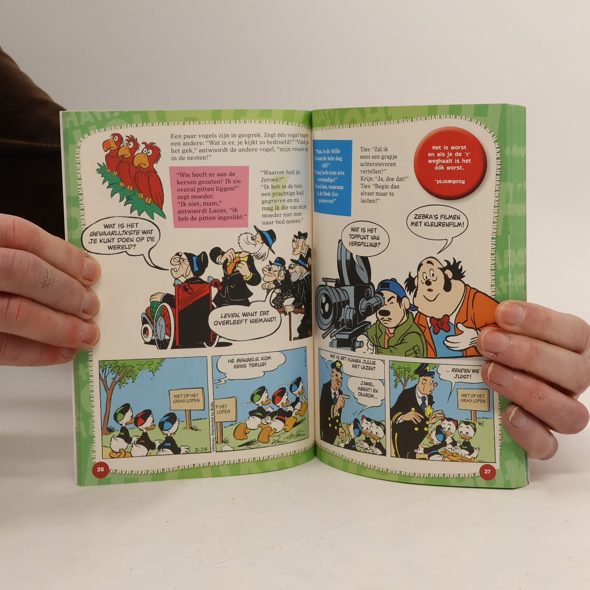 Moppen, raadsels en eenstrooks-ballonstrips waarin Donald Duck een belangrijke rol speelt. Met tekeningen in kleur. Vanaf ca. 8 jaar.
