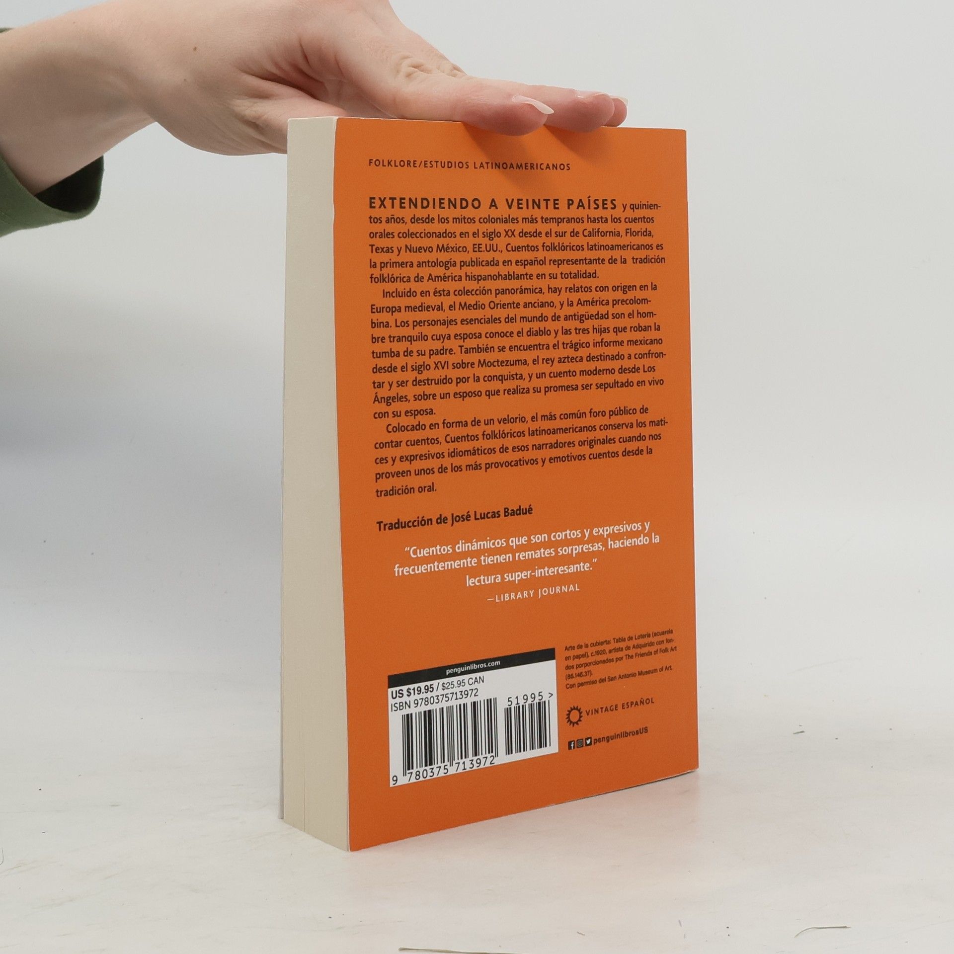 Extendiendo a veinte países y quinientos años, desde los mitos coloniales más tempranos hasta los cuentos orales coleccionados en el siglo veinte desde el sur de California, Florida, Texas y Nuevo México, EE.UU., Cuentos Folklóricos Latinoamericanos es la primera antología publicada en español representante de la tradición folklórico de América hispanohablante en su totalidad. Incluido en ésta colección panorámica, hay relatos con origen en la Europa medieval, el Medio Oriente anciano, y la América precolombina. Los personajes esenciales del mundo de antigüedad son el hombre tranquilo cuya esposa conoce el diablo y las tres hijas que roban la tumba de su padre. También se encuentra el trágico informe Mexicano desde el siglo diez y seis sobre Moctezuma, el rey Azteca destinado a confrontar y ser destruido por la conquista, y un cuento moderno desde Los Angeles, sobre un esposo que realiza su promesa ser sepultado en vivo con su esposa. Colocado en forma de un velorio, el más común foro público de contar cuentos, Cuentos Folklóricos Latinoamericanos conserva los matices y expresivos idiomáticos de esos narradores originales cuando nos proveen unos de los más provocativos e emotivos cuentos desde la tradición oral. Traducción de José Lucas Badué