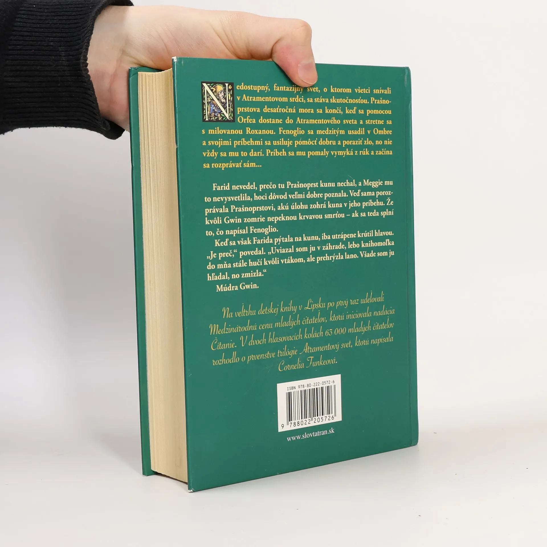 Nedostupný, fantazijný svet, o ktorom všetci snívali v Atramentovom srdci, sa stáva skutočnosťou. Prašnoprstova desaťročná mora sa končí, keď sa pomocou Orfea dostane do Atramentového sveta a stretne sa s milovanou Roxanou. Fenoglio sa medzitým usadil v Ombre a svojimi príbehmi sa usiluje pomôcť dobru a poraziť zlo, no nie vždy sa mu to darí. Príbeh sa mu pomaly vymyká z rúk a začína sa rozprávať sám... Na veľtrhu detskej knihy v Lipsku po prvý raz udeľovali Medzinárodnú cenu mladých čitateľov, ktorú iniciovala nadácia Čítanie. V dvoch hlasovacích kolách 63 000 mladých čitateľov rozhodlo o prvenstve trilógie Atramentový svet, ktorú napísala Cornelia Funkeová.