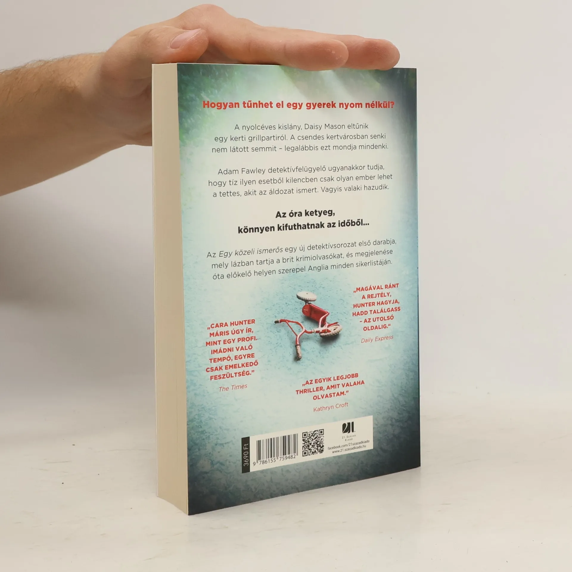 Hogyan tűnhet el egy gyerek nyom nélkül? A nyolcéves kislány, Daisy Mason eltűnik egy egyszerű családi vacsoráról. A csendes kertvárosban senki nem látott semmit – legalábbis ezt mondja mindenki. Adam Fawley detektív ugyanakkor tudja, hogy tíz ilyen esetből kilencben csak olyan ember lehet a tettes, akit az áldozat ismert. Vagyis valaki hazudik. Az óra ketyeg, könnyen kifuthatnak az időből… Az Egy közeli ismerős egy új detektívsorozat első darabja, mely lázban tartja a brit krimiolvasókat és megjelenése óta előkelő helyen szerepel Anglia minden sikerlistáján. „Cara Hunter máris úgy ír, mint egy profi. Imádnivaló tempó, egyre csak emelkedő feszültség”- The Times „Magával ránt a rejtély, Hunter hagyja, hadd találgass – az utolsó oldalig ” – Daily Express „Az egyik legjobb thriller, amit valaha olvastam” – Kathryn Croft