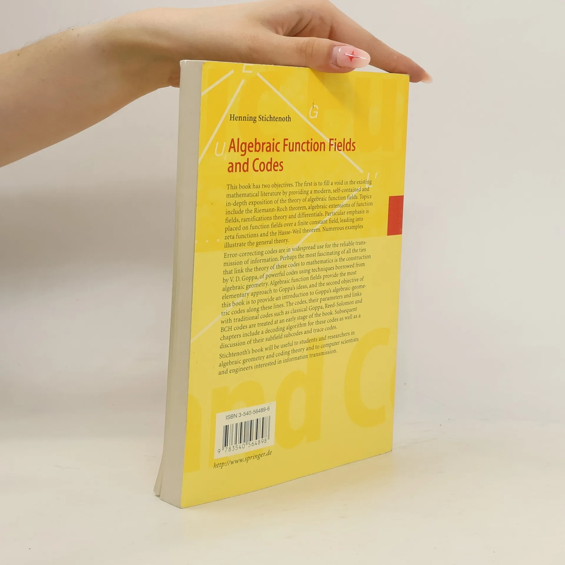 This book has two objectives. The first is to fill a void in the existing mathematical literature by providing a modern, self-contained and in-depth exposition of the theory of algebraic function fields. Topics include the Riemann-Roch theorem, algebraic extensions of function fields, ramifications theory and differentials. Particular emphasis is placed on function fields over a finite constant field, leading into zeta functions and the Hasse-Weil theorem. Numerous examples illustrate the general theory. Error-correcting codes are in widespread use for the reliable transmission of information. Perhaps the most fascinating of all the ties that link the theory of these codes to mathematics is the construction by V.D. Goppa, of powerful codes using techniques borrowed from algebraic geometry. Algebraic function fields provide the most elementary approach to Goppa's ideas, and the second objective of this book is to provide an introduction to Goppa's algebraic-geometric codes along these lines. The codes, their parameters and links with traditional codes such as classical Goppa, Peed-Solomon and BCH codes are treated at an early stage of the book. Subsequent chapters include a decoding algorithm for these codes as well as a discussion of their subfield subcodes and trace codes. Stichtenoth's book will be very useful to students and researchers in algebraic geometry and coding theory and to computer scientists and engineers interested in information transmission.