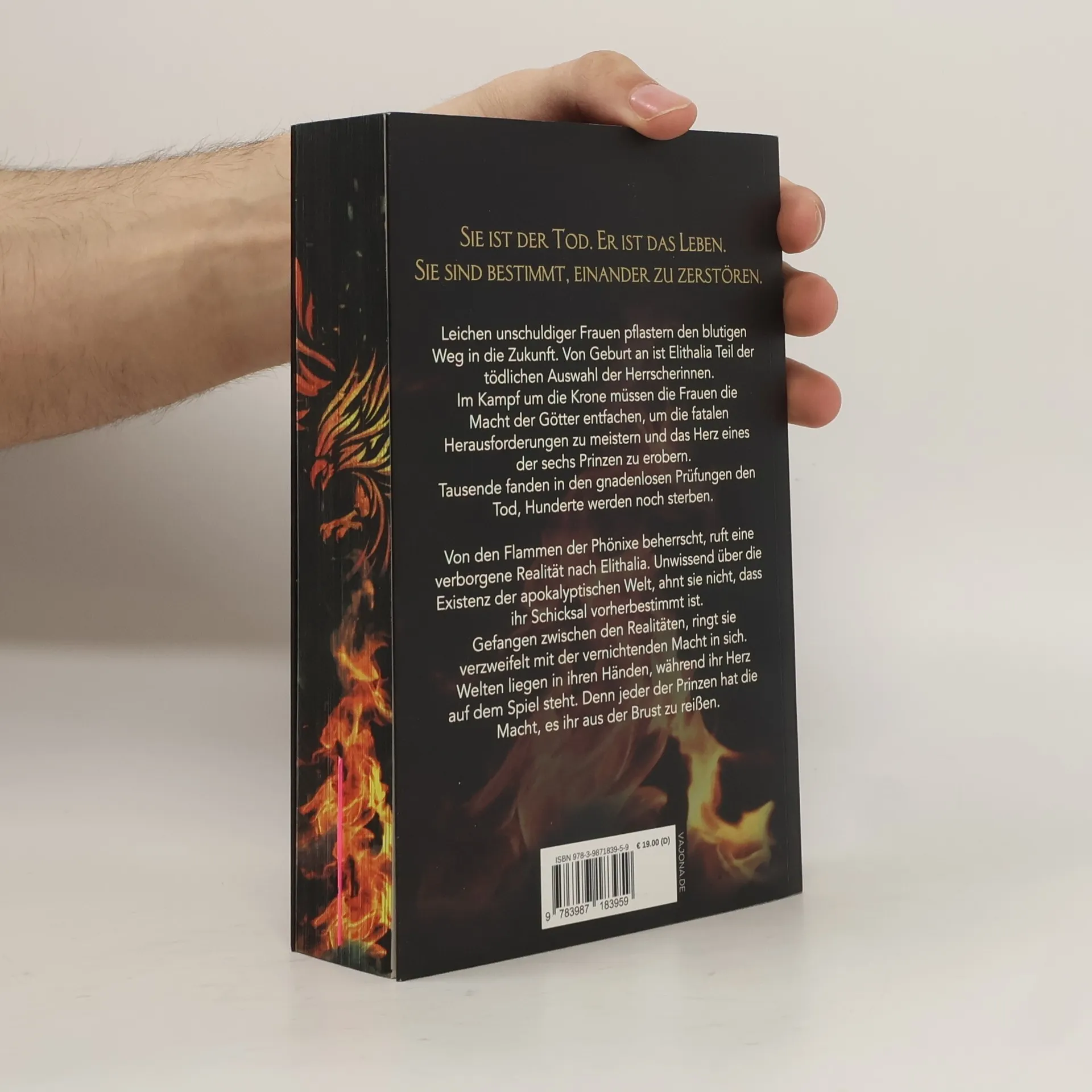 Sie ist der Tod. Er ist das Leben. Sie sind bestimmt, einander zu zerstören. Leichen unschuldiger Frauen pflastern den blutigen Weg in die Zukunft. Von Geburt an ist Elithalia Teil der tödlichen Auswahl der Herrscherinnen. Im Kampf um die Krone müssen die Frauen die Macht der Götter entfachen, um die fatalen Herausforderungen zu meistern und das Herz eines der sechs Prinzen zu erobern. Tausende fanden in den gnadenlosen Prüfungen den Tod, Hunderte werden noch sterben. Von den Flammen der Phönixe beherrscht, ruft eine verborgene Realität nach Elithalia. Unwissend über die Existenz der apokalyptischen Welt, ahnt sie nicht, dass ihr Schicksal vorherbestimmt ist. Gefangen zwischen den Realitäten, ringt sie verzweifelt mit der vernichtenden Macht in sich. Welten liegen in ihren Händen, während ihr Herz auf dem Spiel steht. Denn jeder der Prinzen hat die Macht, es ihr aus der Brust zu reißen.