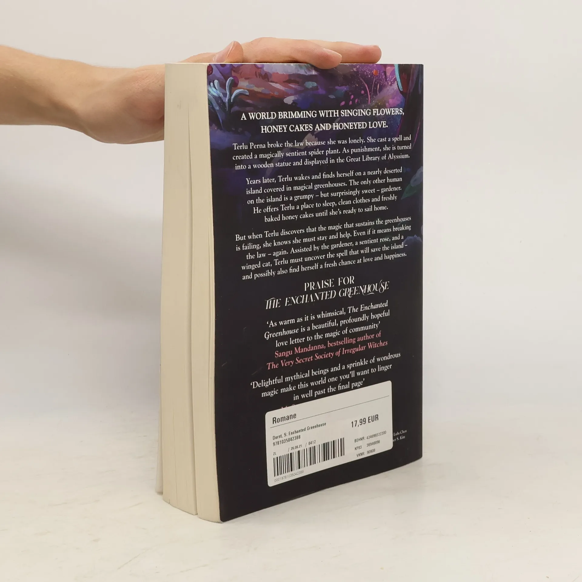 Return to the cosy and heart-warming world of The Spellshop in The Enchanted Greenhouse by Sarah Beth Durst, a world brimming with singing flowers, honey cakes and honeyed love. Terlu Perna broke the law because she was lonely. She cast a spell and created a magically sentient spider plant. As punishment, she was turned into a wooden statue and tucked away into an alcove in the Great Library of Alyssium. When Terlu wakes up, she finds herself on a nearly-deserted island full of hundreds of magical greenhouses. The only other human on the island is a grumpy - but surprisingly sweet - gardener. He offers Terlu a place to sleep, clean clothes and freshly baked honey cakes - at least until she's ready to sail home. But Terlu can't return and doesn't want to. And when she learns that the magic that sustains the greenhouses is failing - causing the death of everything within them - Terlu knows she must stay and help. Even if that means breaking the law again. Assisted by the gardener, a sentient rose and a winged cat, Terlu must uncover the spell that will save the island - and possibly also find a fresh chance at love and happiness along the way. Funny, kind and forgiving, The Enchanted Greenhouse by New York Times bestselling author Sarah Beth Durst is a story about giving second chances - to others and to yourself. Praise for The Spellshop 'Heart-warming cottagecore fantasy' - Lucy Jane Wood, Sunday Times bestselling author of Rewitched 'A warm, peaceful delight of a novel' - Katherine Arden, author of The Bear and the Nightingale 'As comforting as homemade jam on a fresh baked muffin!' - Rebecca Thorne, author of Can't Spell Treason Without Tea