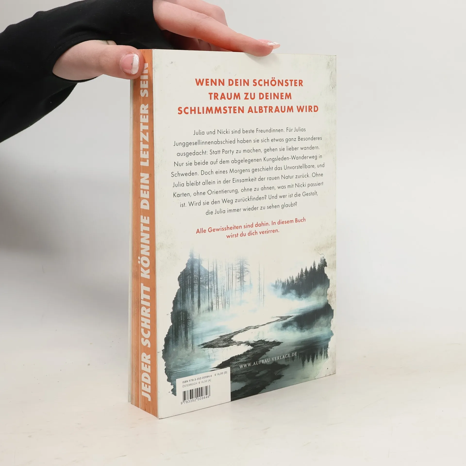 *** Mit wunderschönem farbigen Buchschnitt – limitiert auf die erste Auflage *** Wenn dein schönster Traum zu deinem schlimmsten Albtraum wird Julia und Nicki sind beste Freundinnen. Für Julias Junggesellinnenabschied haben sie sich etwas ganz Besonderes ausgedacht: Statt Party zu machen, gehen sie lieber wandern. Nur sie beide auf dem abgelegenen Kungsleden-Wanderweg in Schweden. Doch eines Morgens geschieht das Unvorstellbare, und Julia bleibt allein in der Einsamkeit der rauen Natur zurück. Ohne Karten, ohne Orientierung, ohne zu ahnen, was mit Nicki passiert ist. Wird sie den Weg zurückfinden? Und wer ist die Gestalt, die Julia immer wieder zu sehen glaubt? Alle Gewissheiten sind dahin. In diesem Buch wirst du dich verirren.