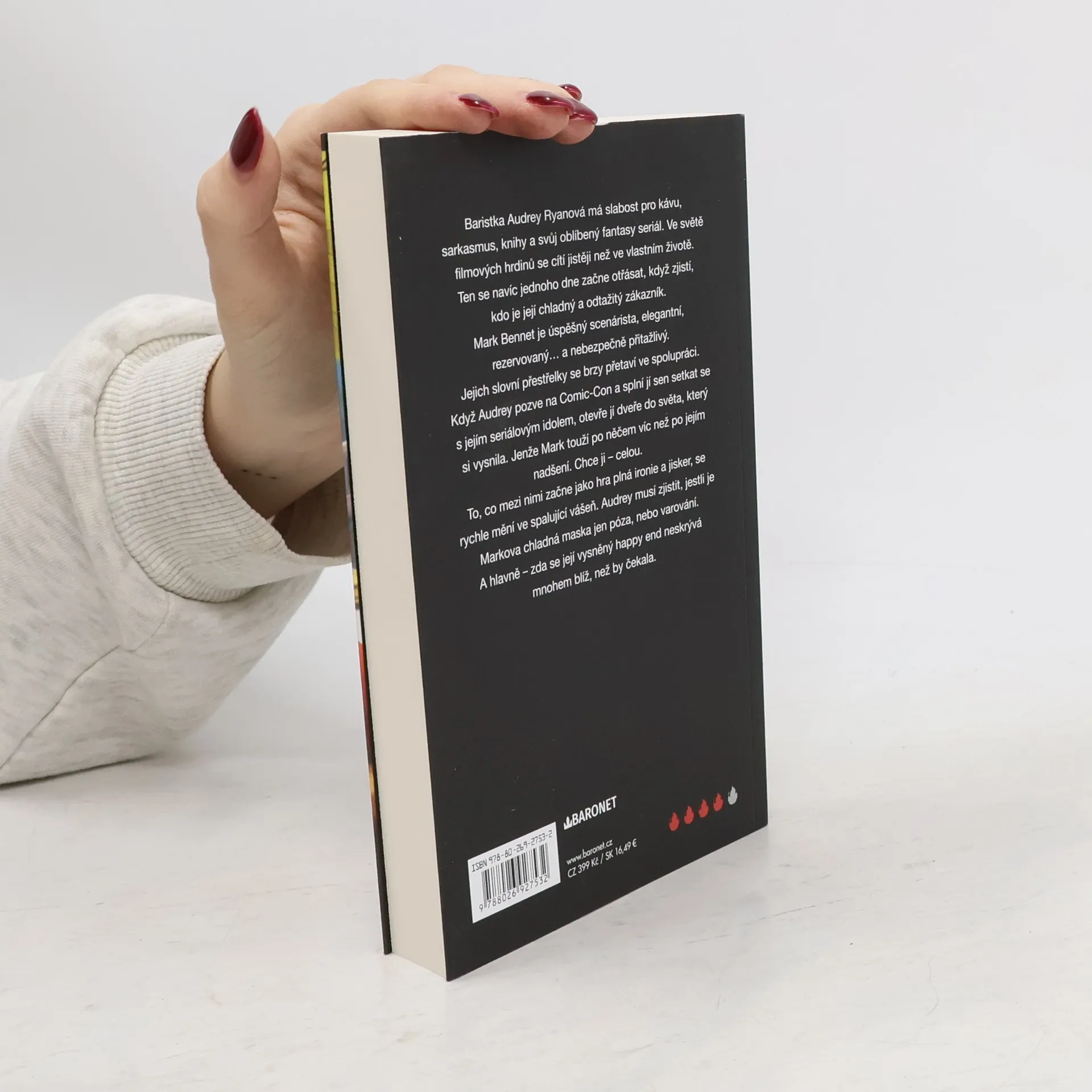 Baristka Audrey Ryanová má slabost pro kávu, sarkasmus, knihy a svůj oblíbený fantasy seriál. Ve světě filmových hrdinů se cítí jistěji než ve vlastním životě. Ten se navíc jednoho dne začne otřásat, když zjistí, kdo je její chladný a odtažitý zákazník. Mark Bennet je úspěšný scénárista, elegantní, rezervovaný… a nebezpečně přitažlivý. Jejich slovní přestřelky se brzo přetaví ve spolupráci. Když Audrey pozve na Comic Con a splní jí sen setkat se s jejím seriálovým idolem, otevře jí dveře do světa, který si vysnila. Jenže Mark touží po něčem víc než po jejím nadšení. Chce ji – celou. To, co mezi nimi začne jako hra plná ironie a jisker, se rychle mění ve spalující vášeň. Audrey musí zjistit, jestli je Markova chladná maska jen póza, nebo varování. A hlavně – zda se její vysněný happy end neskrývá mnohem blíž, než by čekala.