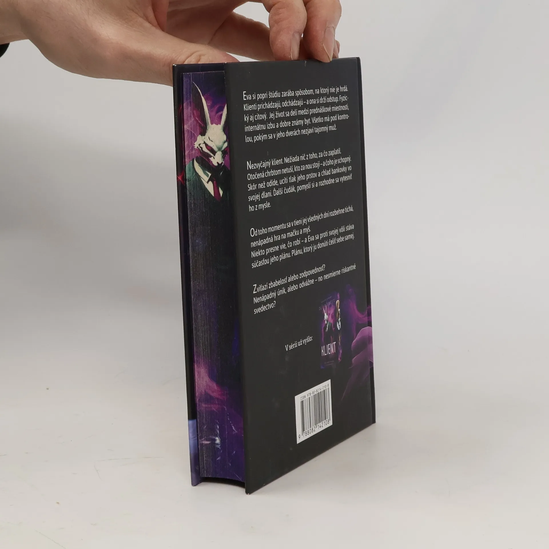 Eva si popri štúdiu zarába spôsobom, na ktorý nie je hrdá. Klienti prichádzajú, odchádzajú — a ona si drží odstup. Fyzický aj citový. Jej život sa delí medzi prednáškové miestnosti, internátnu izbu a dobre známy byt. Všetko má pod kontrolou, pokým sa v jeho dverách nezjaví tajomný muž. Nezvyčajný klient.Nežiada nič z toho, za čo zaplatil.Otočená chrbtom netuší, kto za ňou stojí – a čoho je schopný. Skôr než odíde, ucíti tlak jeho prstov a chlad bankovky vo svojej dlani. Ďalší čudák, pomyslí si a rozhodne sa vytesniť ho z mysle.Od toho momentu sa v tieni jej všedných dní rozbehne tichá, nenápadná hra na mačku a myš.Niekto presne vie, čo robí – a Eva sa proti svojej vôli stáva súčasťou jeho plánu. Plánu, ktorý ju donúti čeliť sebe samej.Zvíťazí zbabelosť alebo zodpovednosť?Nenápadný únik, alebo odvážne – no nesmierne riskantné svedectvo?