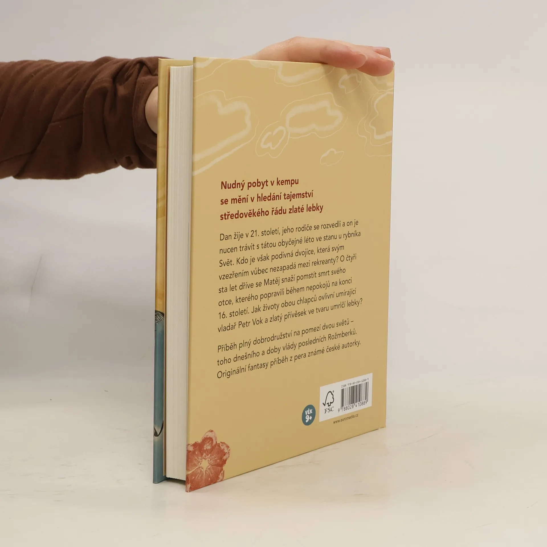 Nudný pobyt v kempu se mění v hledání tajemství středověkého řádu zlaté lebky Dan žije v 21. století, jeho rodiče se rozvedli a on je nucen trávit s tátou obyčejné léto ve stanu u rybníka Svět. Kdo je však podivná dvojice, která svým vzezřením vůbec nezapadá mezi rekreanty? O čtyři sta let dříve se Matěj snaží pomstít smrt svého otce, kterého popravili během nepokojů na konci 16. století. Jak životy obou chlapců ovlivní umírající vladař Petr Vok a zlatý přívěsek ve tvaru umrlčí lebky? Příběh plný dobrodružství na pomezí dvou světů – toho dnešního a doby vlády posledních Rožmberků. Originální fantasy příběh z pera známé české autorky.