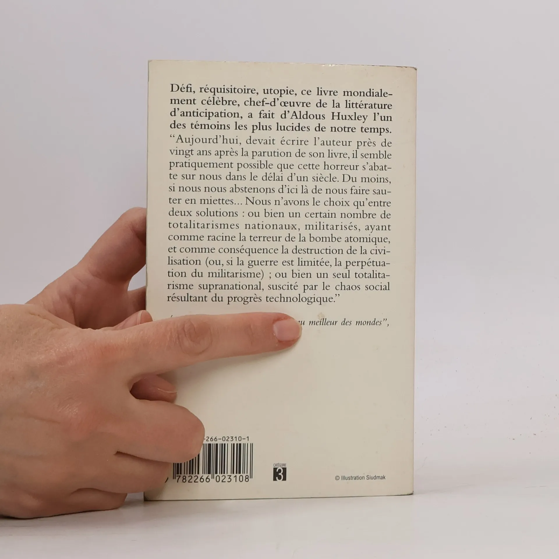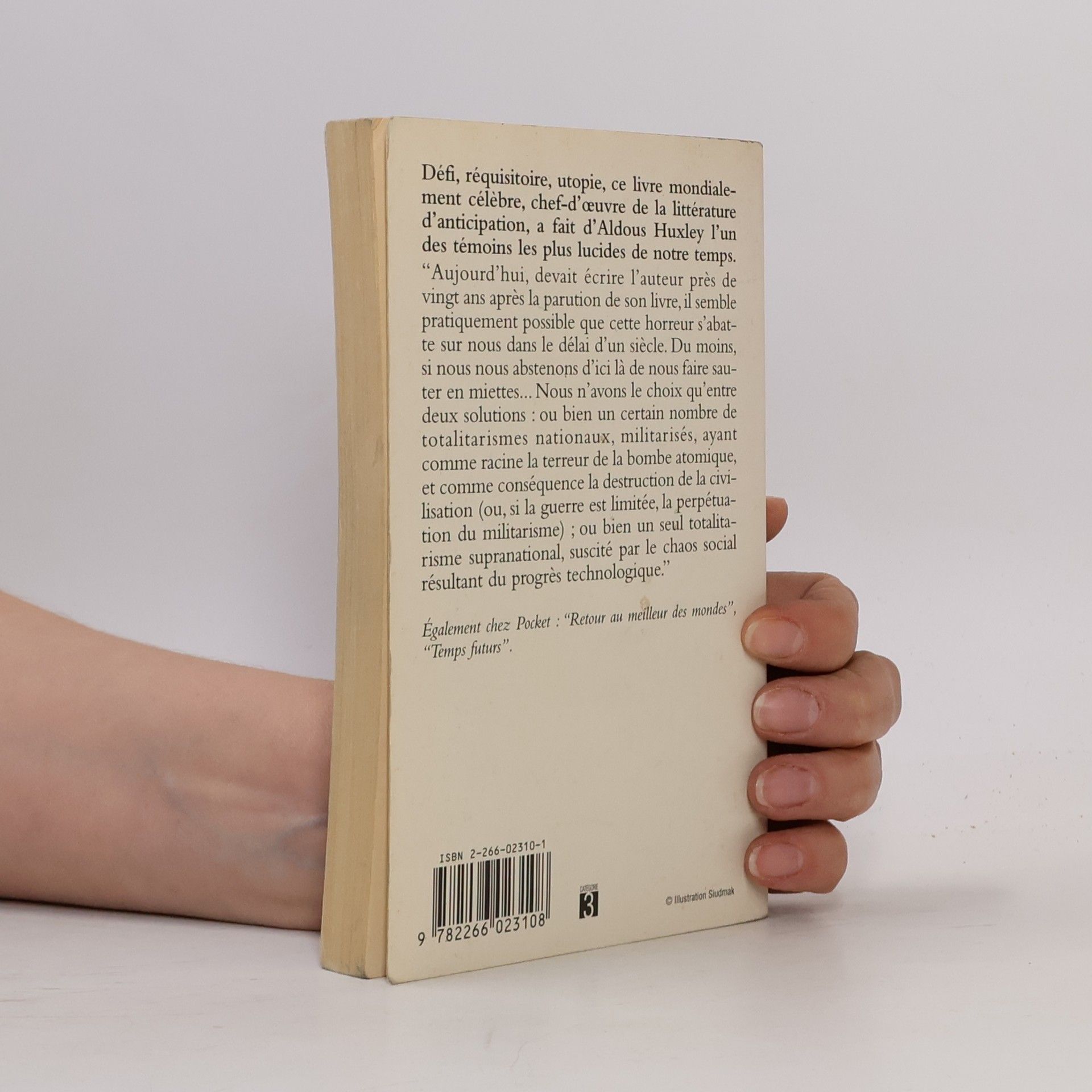 Défi, réquisitoire, utopie, ce livre mondialement célèbre, chef-d'œuvre de la littérature d'anticipation, a fait d'Aldous Huxley l'un des témoins les plus lucides de notre temps. " Aujourd'hui, devait écrire l'auteur près de vingt ans après la parution de son livre, il semble pratiquement possible que cette horreur s'abatte sur nous dans le délai d'un siècle. Du moins, si nous nous abstenons d'ici là de nous faire sauter en miettes... Nous n'avons le choix qu'entre deux solutions : ou bien un certain nombre de totalitarismes nationaux, militarisés, ayant comme racine la terreur de la bombe atomique, et comme conséquence la destruction de la civilisation (ou, si la guerre est limitée, la perpétuation du militarisme) ; ou bien un seul totalitarisme supranational, suscité par le chaos social résultant du progrès technologique ".