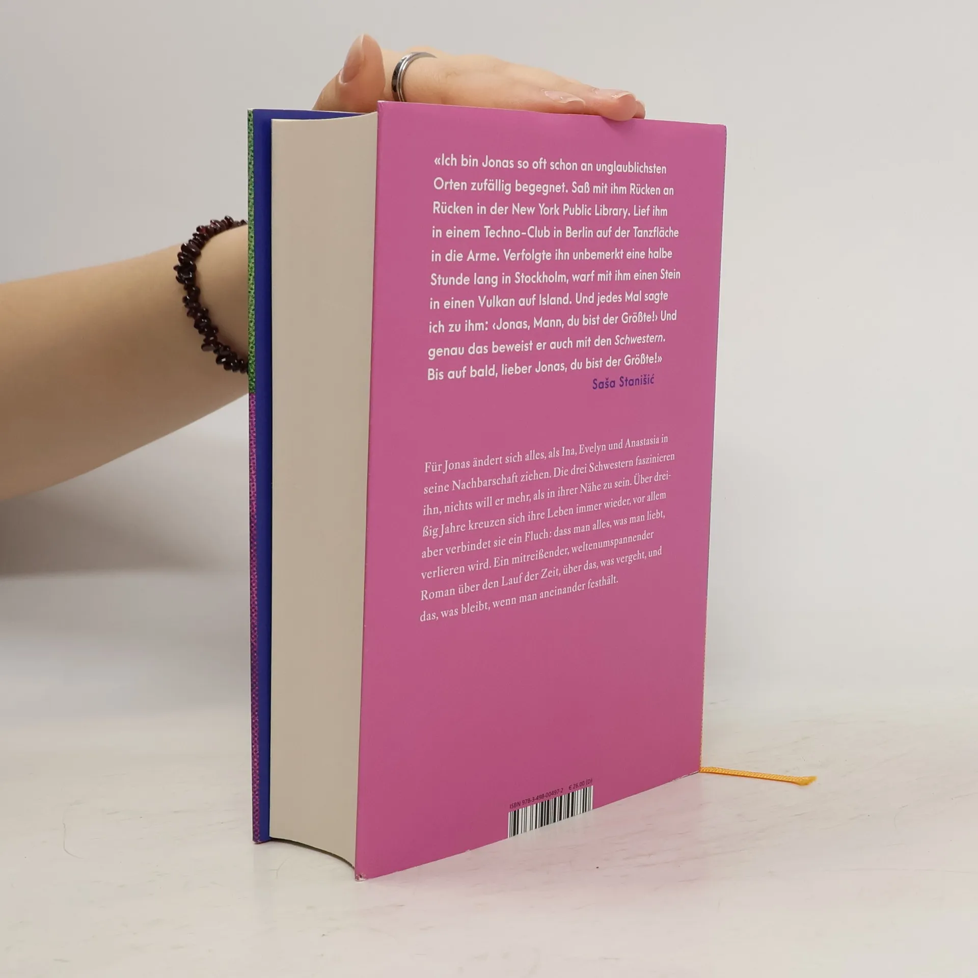 Ein weltenumspannender Roman über drei Schwestern und einen Mann, dessen Leben mit ihnen eng verflochten ist – und über den Fluch der Zeit, über das, was vergeht, und das, was bleibt, wenn man aneinander festhält..Für Jonas ändert sich alles, als Ina, Evelyn und Anastasia in seine Nachbarschaft ziehen. Ihre Mutter kommt aus Tunesien, wer ihr Vater ist, weiß niemand. Die ernsthafte Ina, die verträumte Evelyn und die chaotische Anastasia faszinieren den Erzähler, nichts will er mehr, als in ihrer Nähe zu sein. Ihm wird klar, dass die Schwestern mit seiner Familie und der Vergangenheit seines Vaters eng verflochten sind. Über dreißig Jahre kreuzen sich ihre Leben immer wieder, in Tunesien, Schweden, den USA, sie erleben Liebesgeschichten und Lebenskrisen. Vor allem aber verbindet sie ein dass man alles, was man liebt, verlieren wird.«Ich bin Jonas so oft schon an unglaublichsten Orten zufällig begegnet. Saß mit ihm Rücken an Rücken in der New York Public Library. Lief ihm in einem Techno-Club in Berlin auf der Tanzfläche in die Arme. Verfolgte ihn unbemerkt eine halbe Stunde lang in Stockholm, warf mit ihm einen Stein in einen Vulkan auf Island. Und jedes Mal sagte ich zu ‹Jonas, Mann, du bist der Größte!› Und genau das beweist er auch mit den "Schwestern". Bis auf bald, lieber Jonas, du bist der Größte!» Saša Stanišić