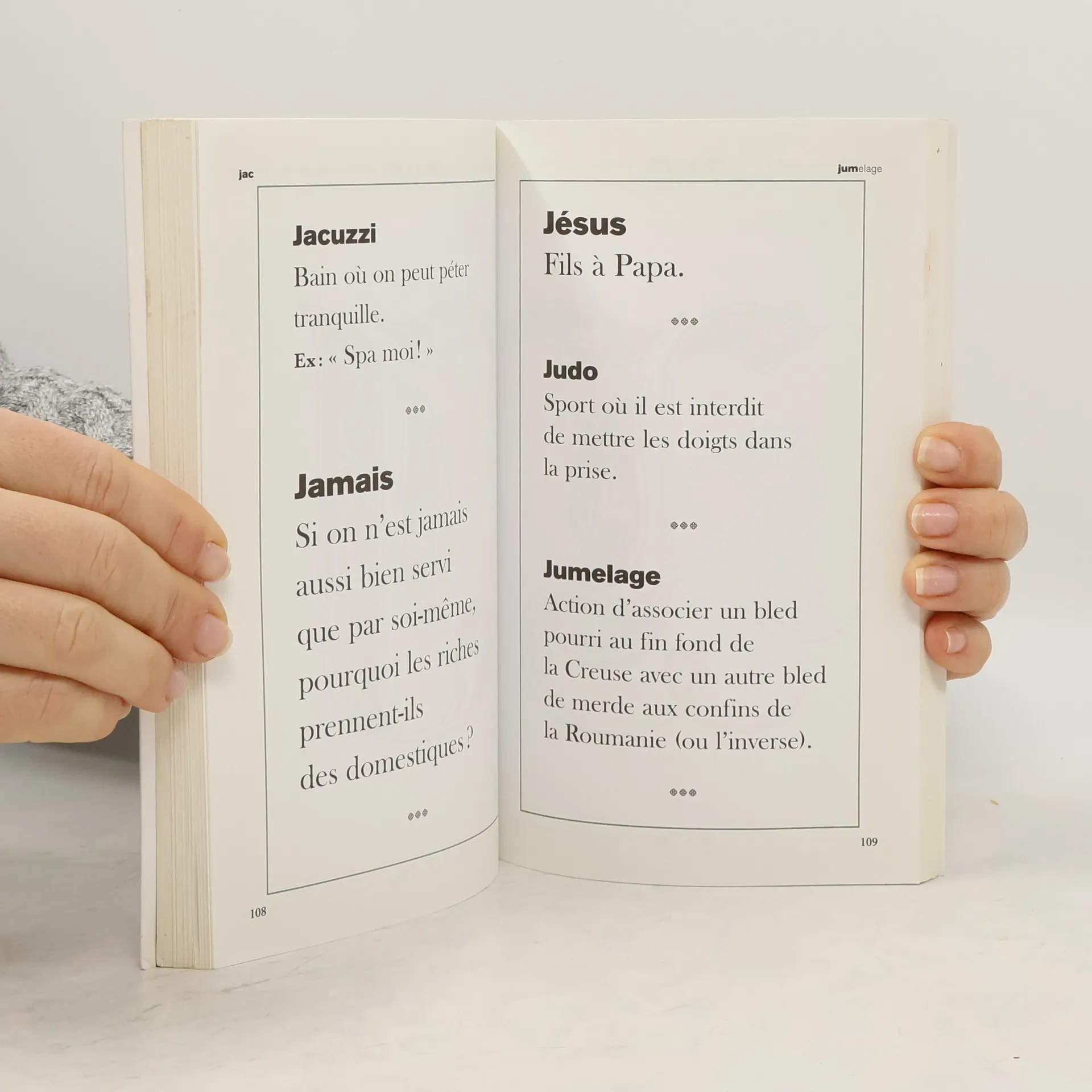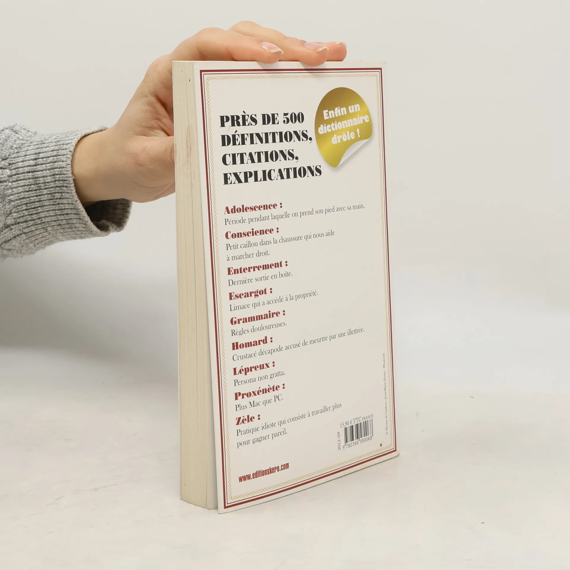 Enfin un dictionnaire drôle ! Près de 500 définitions, citations, explications. Adolescence : Période pendant laquelle on prend son pied avec sa main. Conscience : Petit caillou dans la chaussure qui nous aide à marcher droit. Enterrement : Dernière sortie en boîte. Escargot : Limace qui a accédé à la propriété. Grammaire : Règles douloureuses. Homard : Crustacé décapode accusé de meurtre par une illettrée. Lépreux : Persona non gratta. Portier : Ouvre-boîte. Zèle : Pratique idiote qui consiste à travailler plus pour gagner pareil.