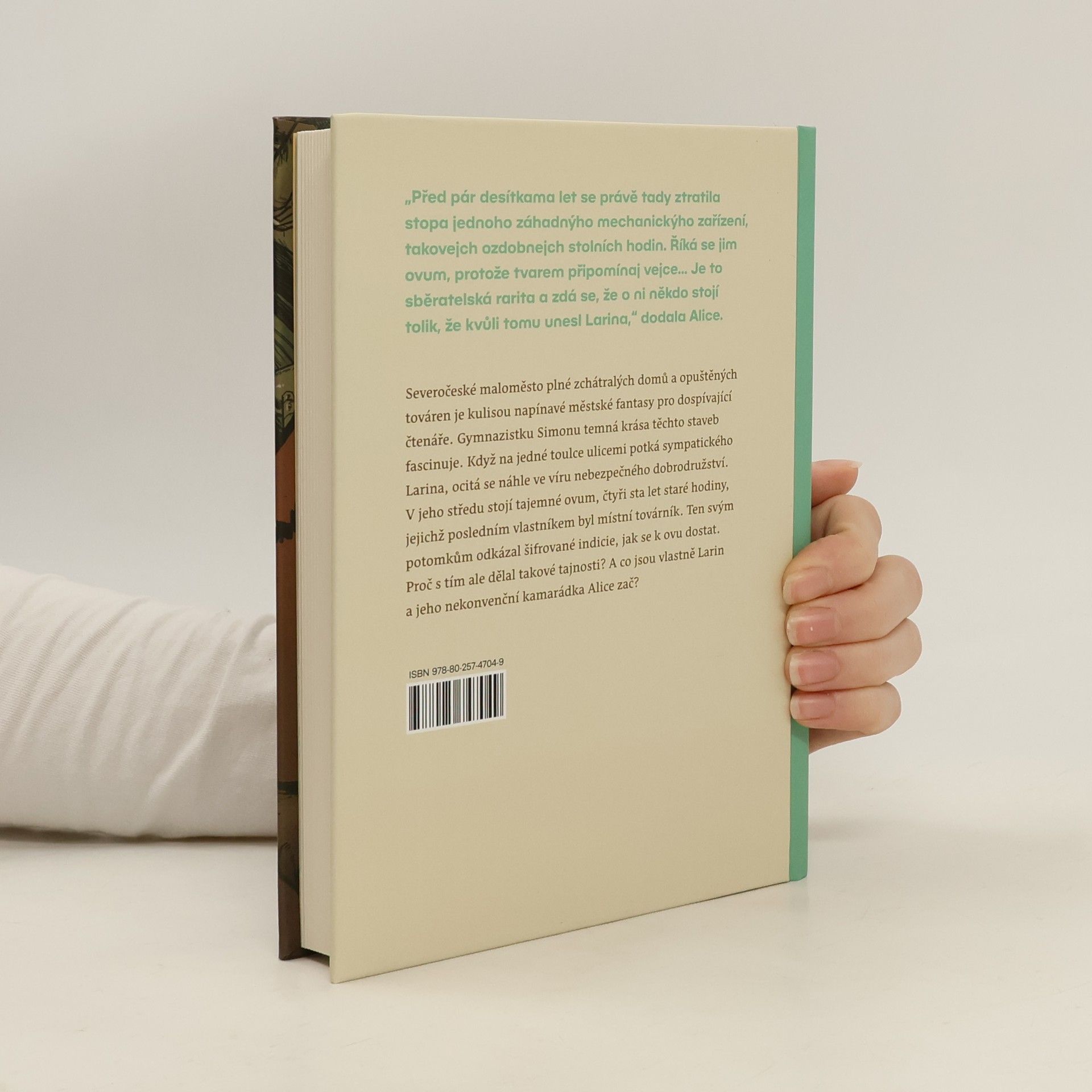 Severočeské maloměsto plné starých, zchátralých domů a pustnoucích továren je kulisou napínavé urban fantasy pro dospívající čtenáře. Gymnazistku Simonu temná krása staveb fascinuje. Na jedné toulce ulicemi potká Larina, který také prolézá staré budovy, ale z jiných důvodů. Než se o nich Simona může dozvědět víc, Larina někdo unese a ona se ocitá ve víru nebezpečného dobrodružství. V jeho středu stojí tajemné Ovum, čtyři sta let staré hodiny ve tvaru vejce, jejichž posledním známým vlastníkem byl místní továrník. Ten svým potomkům odkázal záhadné indicie, jak se k Ovu dostat. Proč s tím dělal takové tajnosti? A co jsou vlastně Larin a jeho nekonvenční kamarádka Alice zač? Nakladatelská anotace. Kráceno.
