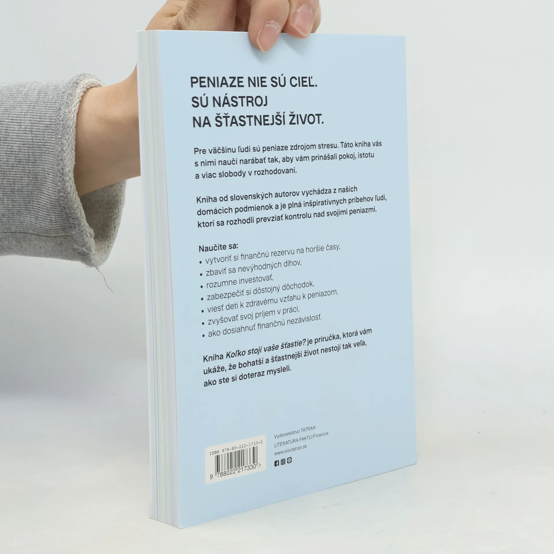 Peniaze nie sú cieľ. Predstavujú nástroj na šťastnejší život. Pre väčšinu ľudí sú však zdrojom stresu. Táto kniha vás naučí narábať s nimi tak, aby vám prinášali pokoj, istotu a viac slobody v rozhodovaní. V desiatich praktických krokoch si na začiatku upraceme osobné financie, vytvoríme rezervy, zbavíme sa dlhov a začneme investovať na dôchodok. To vám vytvorí priestor, aby ste sa neskôr sústredili na zvyšovanie príjmu, finančné vzdelávanie svojich detí a získanie skutočnej finančnej slobody. Koľko stojí vaše šťastie? je kniha pre každého. Na zvládnutie jednotlivých krokov nebudete potrebovať nadpriemerný príjem ani znalosti z ekonómie či zložitých investičných pojmov. Stačí odhodlanie zmeniť svoje návyky k lepšiemu a naučiť sa niečo nové o tom, ako fungujú peniaze. Knihu napísali slovenskí autori, vychádza z našich domácich podmienok a je plná inšpiratívnych príbehov ľudí, ktorí sa rozhodli prevziať kontrolu nad svojimi peniazmi. Ukáže vám, že bohatší a šťastnejší život nevyžaduje tak veľa, ako ste si doteraz mysleli.
