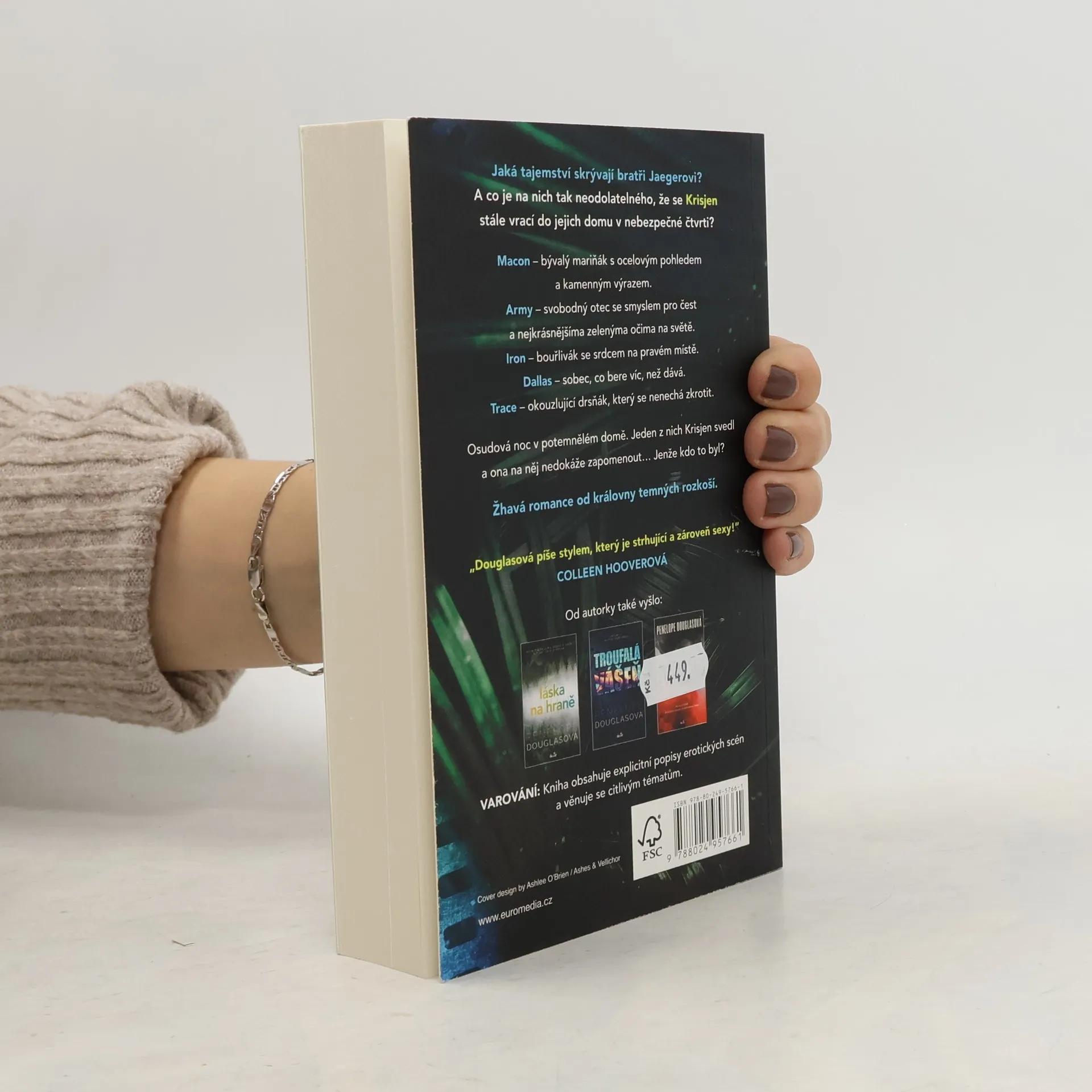 Krisjen žije v bohaté čtvrti, ale rozvod rodičů a péče o mladší sourozence ji momentálně tak vyčerpávají, že se raději chodí odreagovat na nebezpečnou druhou stranu městečka. Tam bydlí bratři Jaegerovi. Nejstarší Macon, bývalý mariňák, který se snad nikdy neusmívá. Army, singl táta s nejkrásnějšíma zelenýma očima na světě. Iron, fajn kluk s prudkou povahou, která ho brzy dostane do vězení. Dallas, sobec, který umí jen brát, a co zbyde, jednoduše odhodí. A Trace, s nímž se Krisjen tak trochu zaplete. Jenže když ji jedné noci v potemnělém domě někdo vezme do náruče, něco jí říká, že to není Trace.
