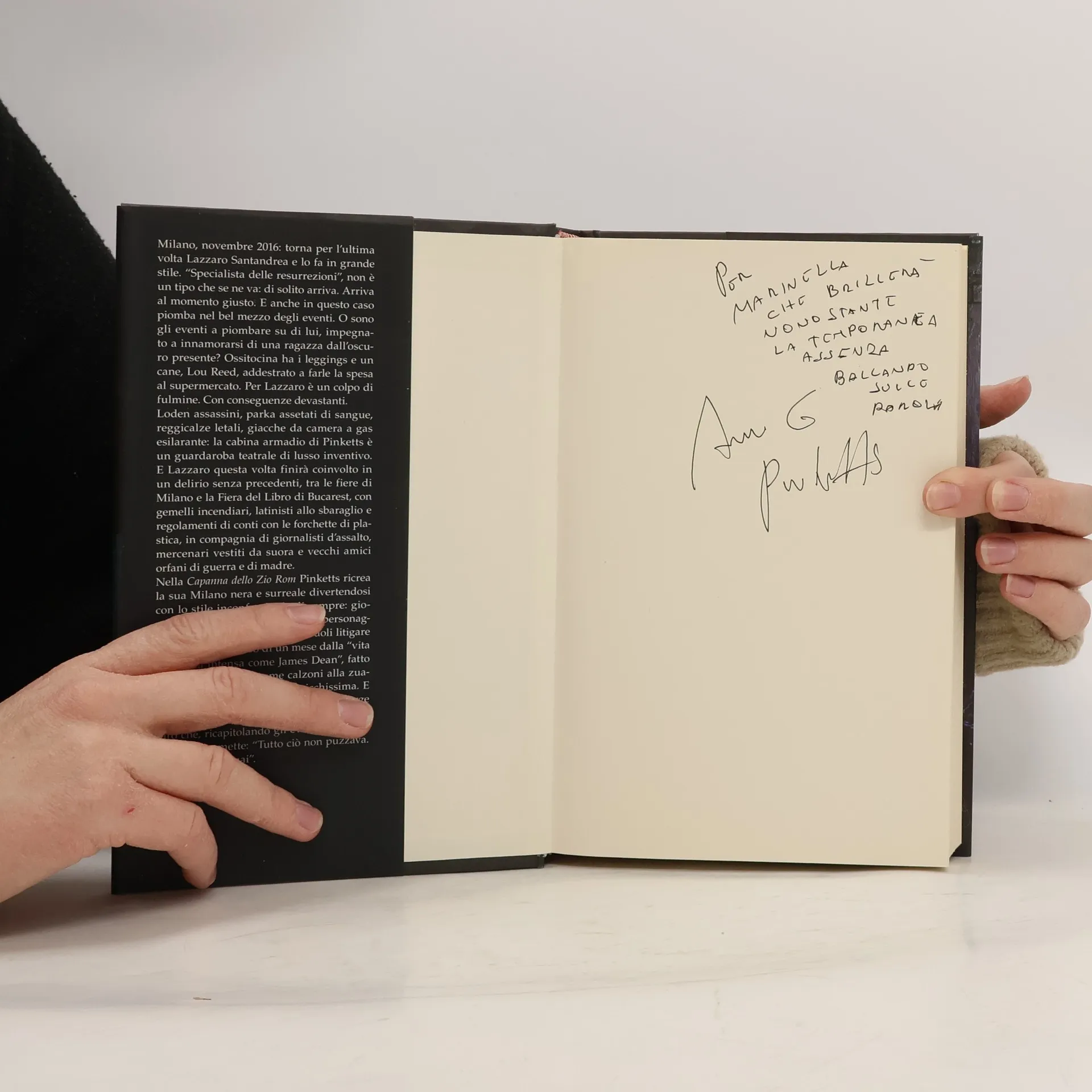 Milano, novembre 2016: Lazzaro Santandrea torna per l'ultima volta, un "specialista delle resurrezioni" che non si allontana mai senza lasciare il segno. Questa volta, si ritrova nel mezzo di eventi inaspettati mentre si innamora di Ossitocina, una ragazza dal passato misterioso, che ha un cane, Lou Reed, addestrato a fare la spesa. La sua attrazione si trasforma in una serie di conseguenze devastanti. Il guardaroba di Pinketts è un mix teatrale di elementi eccentrici: loden assassini, parka assetati di sangue e giacche da camera esilaranti. Lazzaro si ritrova coinvolto in un'avventura senza precedenti tra le fiere di Milano e Bucarest, affrontando gemelli incendiari e latinisti in difficoltà, accompagnato da giornalisti d'assalto e mercenari travestiti da suore. Nella Capanna dello Zio Rom, Pinketts ricrea una Milano nera e surreale, giocando con parole e personaggi, facendo persino litigare i capitoli. In un mese di eventi intensi, ricchi di colpi di scena, Lazzaro riflette su tutto ciò che accade, ammettendo che "profumava di guai". La lettura si fa sempre più avvincente man mano che la trama si complica.