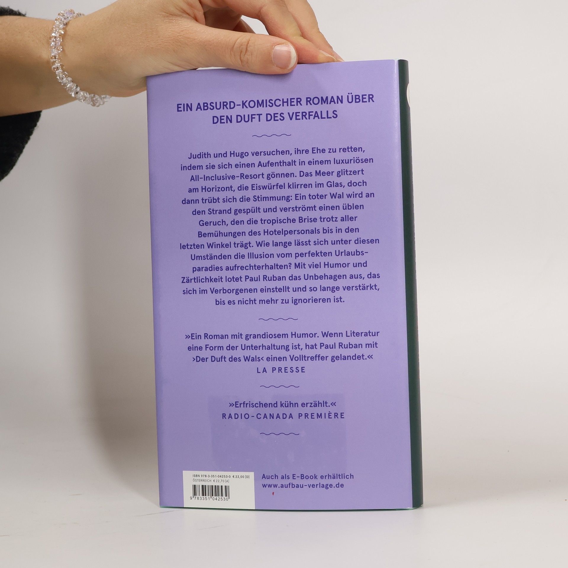 Der Überraschungserfolg aus Kanada! Ein absurd-komischer Roman über den Duft des Verfalls Judith und Hugo versuchen, ihre Ehe zu retten, indem sie sich einen Aufenthalt in einem luxuriösen All-inclusive-Resort in Mexiko gönnen. Das Meer glitzert am Horizont, die Eiswürfel klirren im Glas, doch dann trübt sich die Stimmung: Ein toter Wal wird an den Strand gespült und verströmt einen üblen Geruch, den die tropische Brise trotz aller Bemühungen des Hotelpersonals bis in den letzten Winkel trägt. Wie lange lässt sich unter diesen Umständen die Illusion vom perfekten Urlaubsparadies aufrechterhalten? Mit viel Humor und Zärtlichkeit lotet Paul Ruban das Unbehagen aus, das sich im Verborgenen einstellt und so lange verstärkt, bis es nicht mehr zu ignorieren ist. »Ein Roman mit grandiosem Humor. Wenn Literatur eine Form der Unterhaltung ist, hat Paul Ruban mit ›Der Duft des Wals‹ einen Volltreffer gelandet.« La Presse »Erfrischend kühn erzählt.« Radio-Canada Première