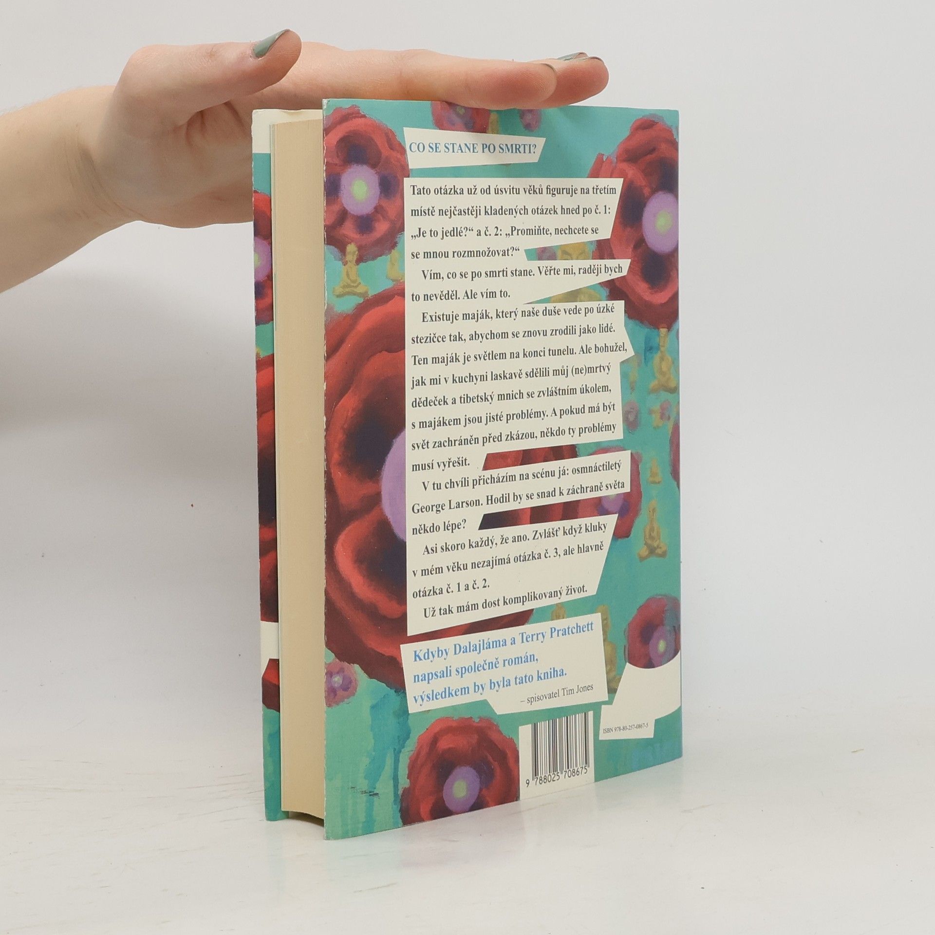 George Larkson je obyčejný kluk na Novém Zélandu: sní o tom, že se stane rockovou hvězdou, tajně miluje svoji spolužačku a ve škole se k smrti nudí. Jeho život se však obrátí v naprostý chaos, když ho jednou v noci navštíví jeho mrtvý dědeček. Vzápětí mu začnou předávat tajuplné zprávy pavouci a k završení všeho se ráno ve dveřích objeví neznámý tibetský mnich s životně důležitým úkolem: George je jediný, kdo může zachránit lidstvo a celý svět před zkázou – záhadný reinkarnační maják nesmí padnout do zločinných rukou... Přestože román zkoumá vážná témata, jako je smrt, reinkarnace, ekologické hrozby, přelidnění a otázka svobodné vůle, činí tak osvěžujícím způsobem: kombinuje fantasy, science fiction, dobrodružno a komično, překypuje svižnou akcí, energickými dialogy a okamžiky, kdy budete doslova vybuchovat smíchy. Ideální čtení pro přemýšlivé dospívající i jejich rodiče. -- 1. vydání.