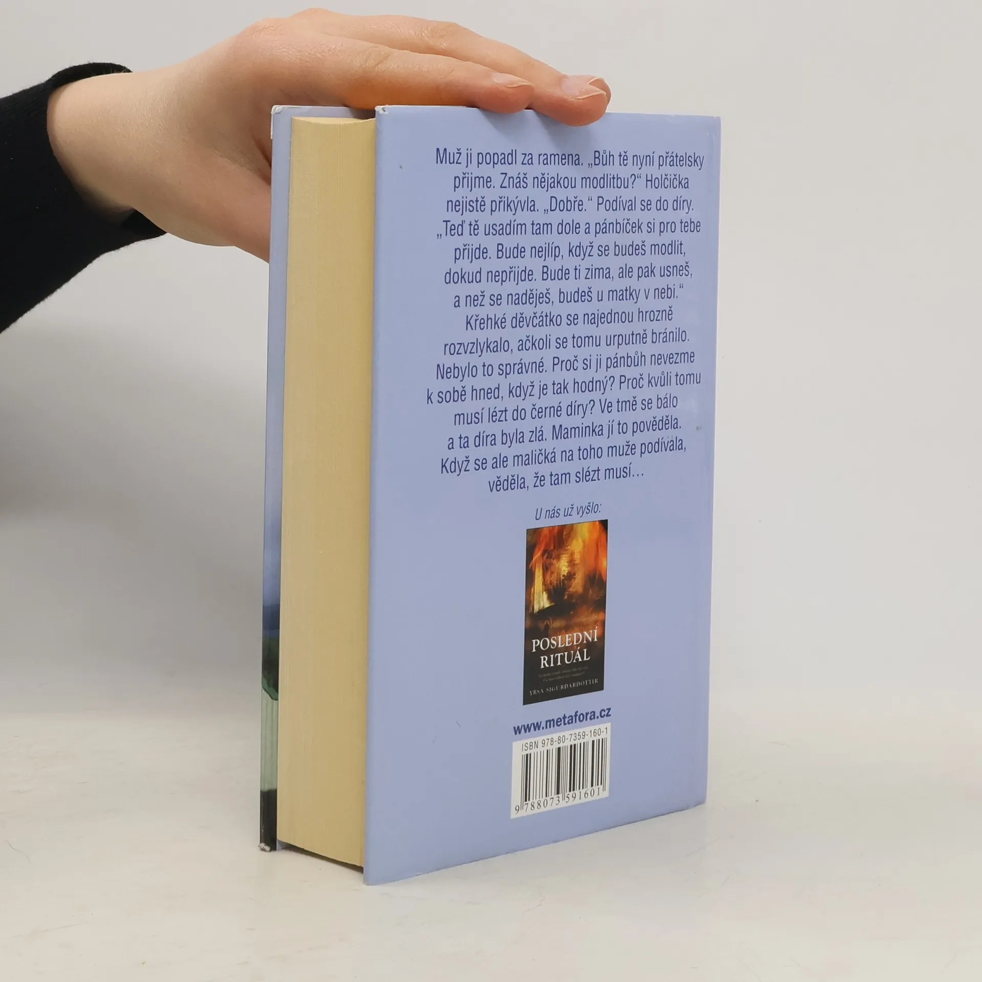V nově postaveném hotelu obchází duch, ale zavražděná je až příliš skutečná… Od autorky thrilleru Poslední rituál. Když advokátce Tóře zavolá její kamarád Jónas, pomyslí si, že si z ní tropí žerty. V ezotericky zaměřeném hotelu, který vybudoval na pozemcích dvou starých statků, prý straší. Tóra sice na ducha nevěří, ale mrtvole místní architektky nalezené na pláži uvěřit musí. Vyšetřování jde ztěžka, zvlášť proto, že některá vlákna prorůstají hluboko do minulosti. Co se to vlastně před lety odehrálo? Kdo je tajemná Kristín, která jako by nikdy neexistovala? Když se do všeho zaplete jeden letitý a jeden ambiciózní politik, zohavený mladý muž na vozíku a náznaky čísi nacistické minulosti, je toho právě dost, aby to všem pořádně zamotalo hlavu. Větrné islandské pobřeží, kde se náš příběh odehrává, je dokonalou kulisou pro dávnou legendu o lásce, smrti a tajemství sahajících až do našich časů...