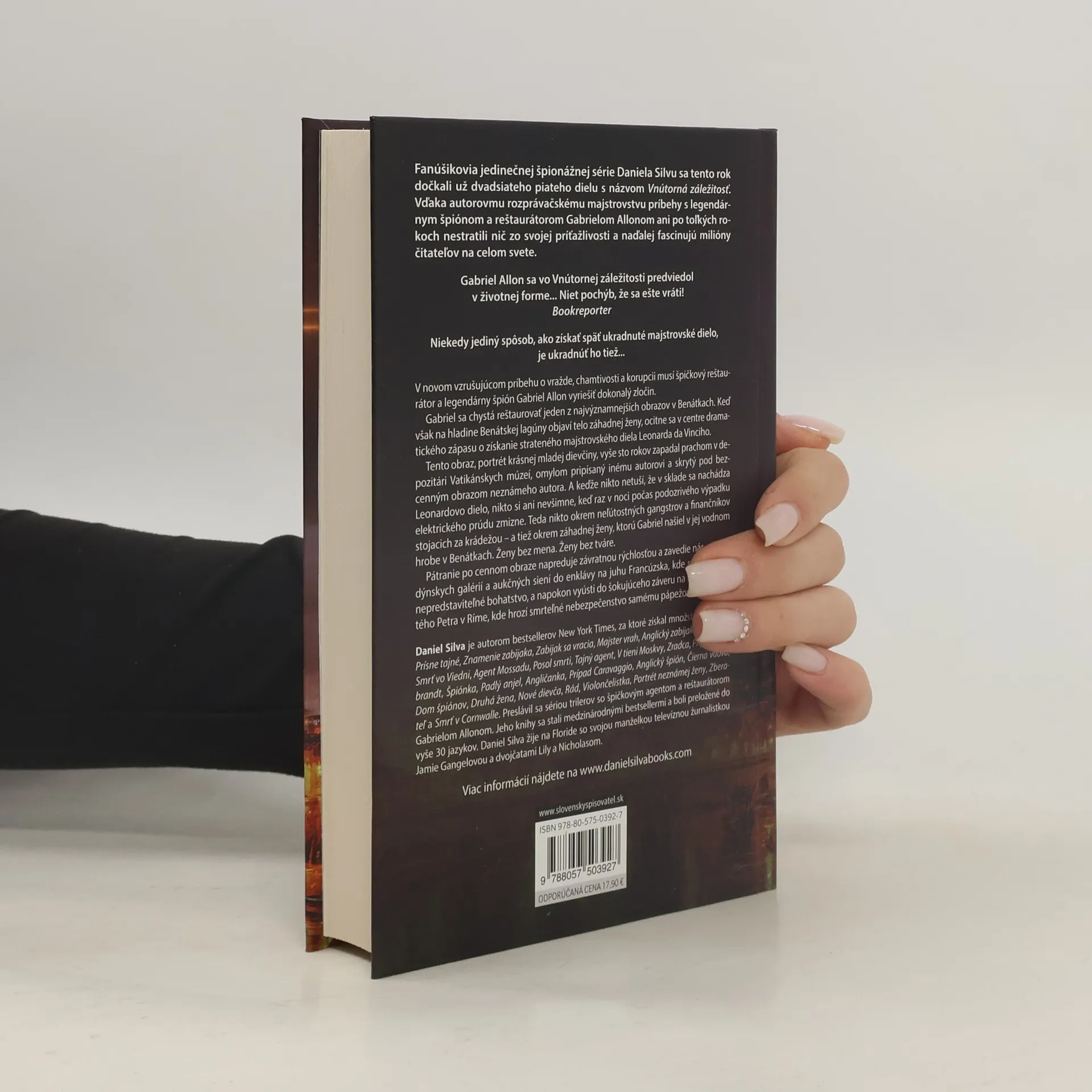 Niekedy jediný spôsob, ako získať späť ukradnuté majstrovské dielo, je ukradnúť ho tiež... V novom vzrušujúcom príbehu o vražde, chamtivosti a korupcii musí špičkový reštaurátor a legendárny špión Gabriel Allon vyriešiť dokonalý zločin. Gabriel sa chystá reštaurovať jeden z najvýznamnejších obrazov v Benátkach. Keď však na hladine Benátskej lagúny objaví telo záhadnej ženy, ocitne sa v centre dramatického zápasu o získanie strateného majstrovského diela Leonarda da Vinciho. Tento obraz, portrét krásnej mladej dievčiny, vyše sto rokov zapadal prachom v depozitári Vatikánskych múzeí, omylom pripísaný inému autorovi a skrytý pod bezcenným obrazom neznámeho autora. A keďže nikto netuší, že v sklade sa nachádza Leonardovo dielo, nikto si ani nevšimne, keď raz v noci počas podozrivého výpadku elektrického prúdu zmizne. Teda nikto okrem neľútostných gangstrov a finančníkov stojacich za krádežou – a tiež okrem záhadnej ženy, ktorú Gabriel našiel v jej vodnom hrobe v Benátkach. Ženy bez mena. Ženy bez tváre. Pátranie po cennom obraze napreduje závratnou rýchlosťou a zavedie nás od londýnskych galérií a aukčných siení do enklávy na juhu Francúzska, kde sa sústredilo nepredstaviteľné bohatstvo, a napokon vyústi do šokujúceho záveru na Námestí svätého Petra v Ríme, kde hrozí smrteľné nebezpečenstvo samému pápežovi...