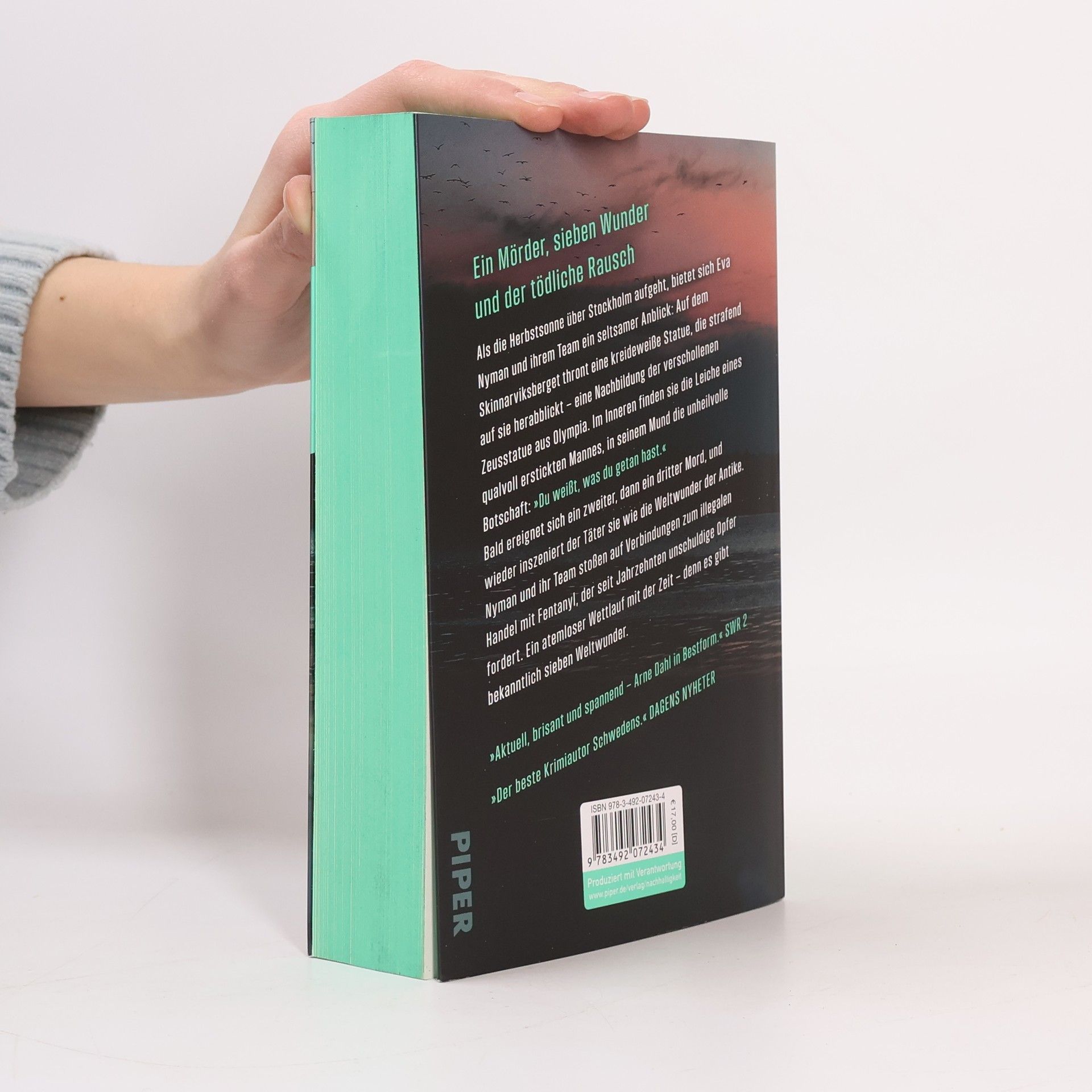 Eva Nyman jagt einen Killer, der Rache zur Kunst erhebt Als die Herbstsonne über Stockholm aufgeht, bietet sich Eva Nyman und ihrem Team ein seltsamer Anblick: Auf dem Skinnarviksberg thront eine kreideweiße Statue, die strafend auf sie herabblickt – eine Nachbildung der verschollenen Zeusstatue aus Olympia. Im Inneren finden sie die Leiche eines qualvoll erstickten Mannes, in seinem Mund die unheilvolle Botschaft: »Du weißt, was du getan hast.« Bald ereignet sich ein zweiter, dann ein dritter Mord, und wieder inszeniert der Täter sie als Weltwunder der Antike. Die Spuren führen in die Drogenszene, wo der illegale Handel mit Fentanyl seit Jahrzehnten unschuldige Opfer fordert. Kann Eva Nyman den Mörder stoppen, bevor er seine grausame Serie vollendet? Denn es gibt bekanntlich sieben Weltwunder …