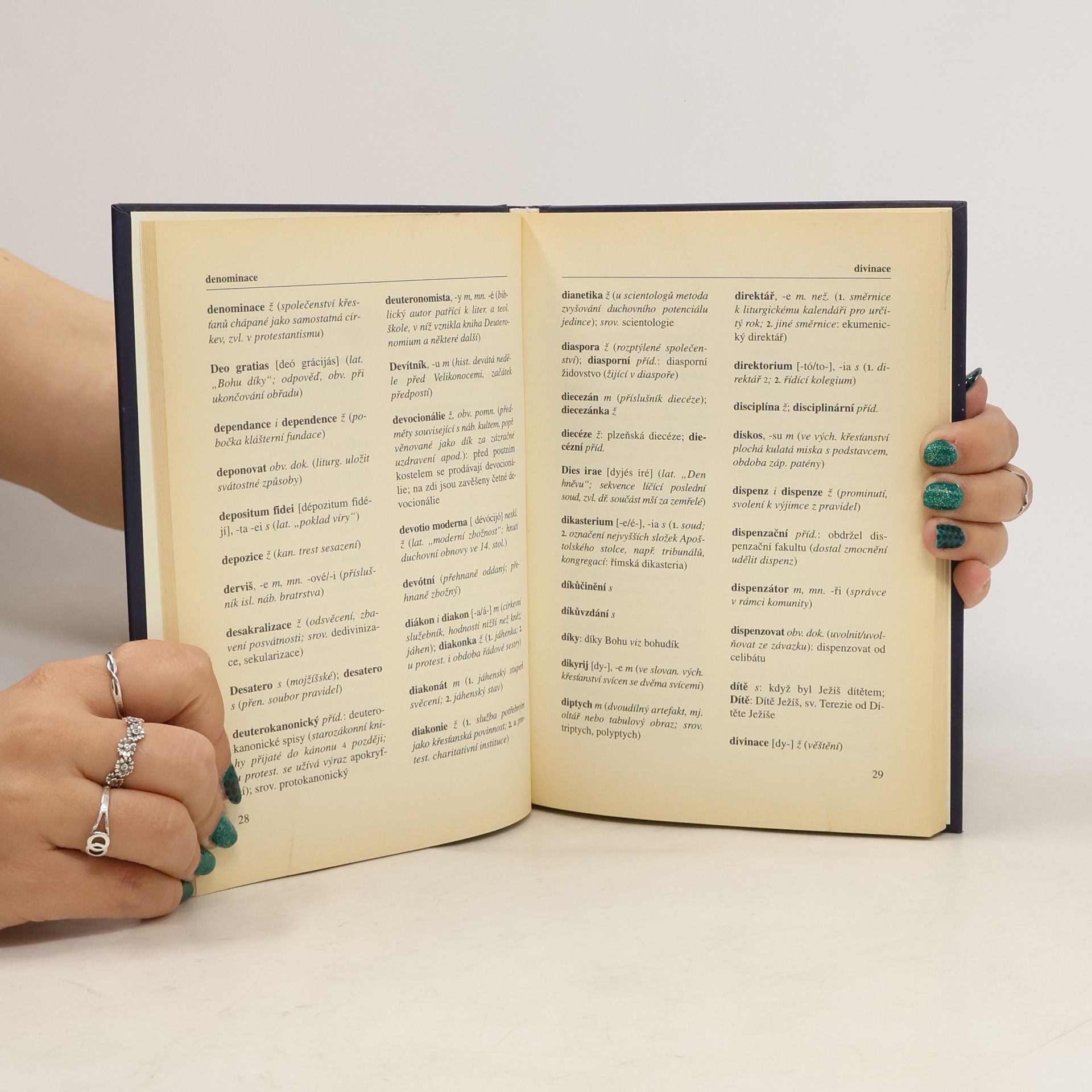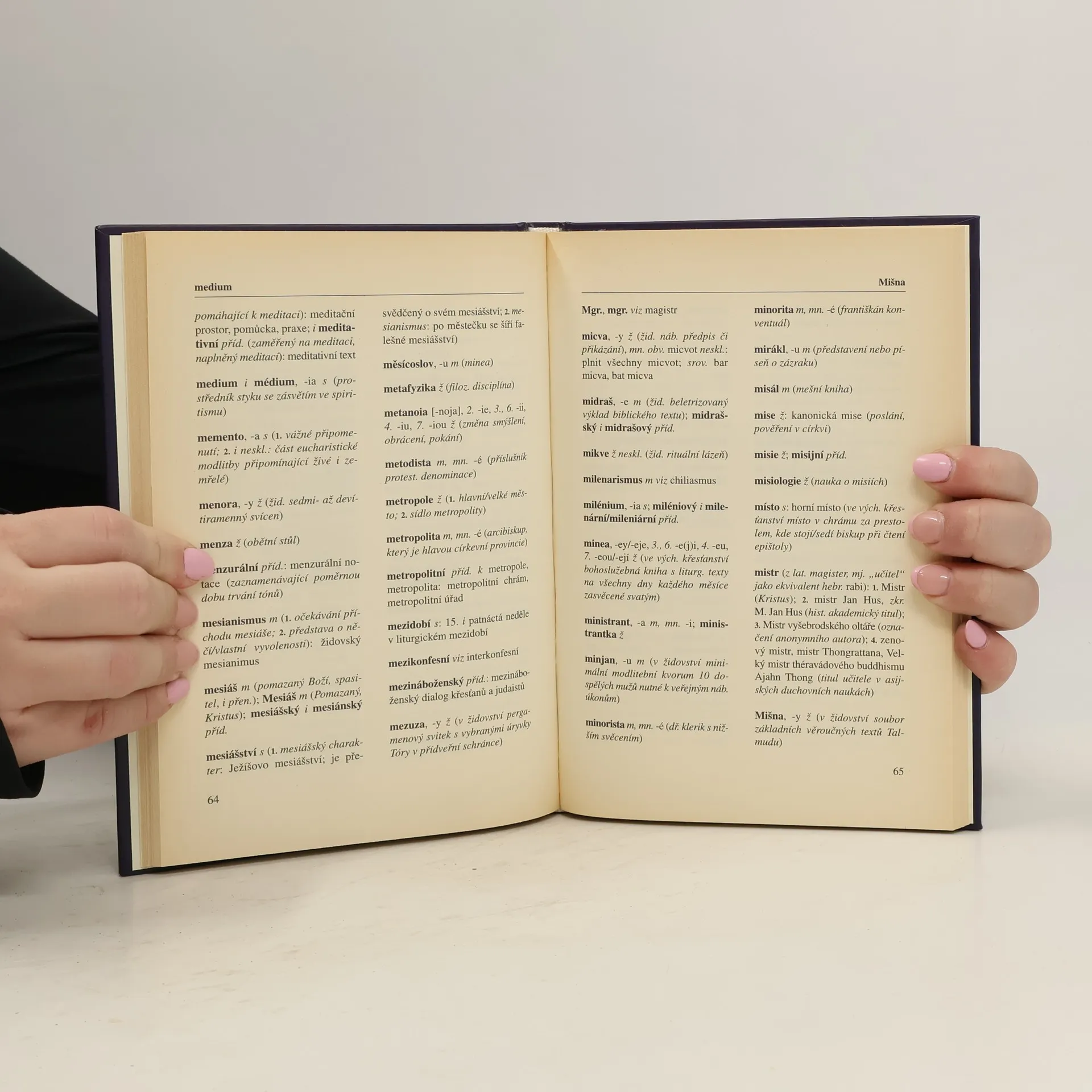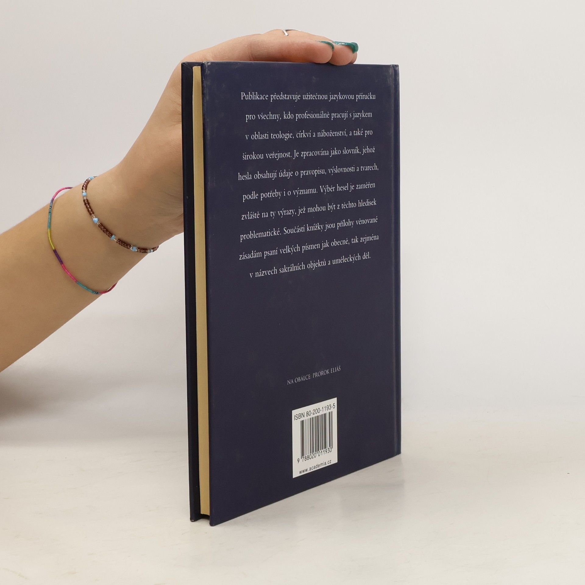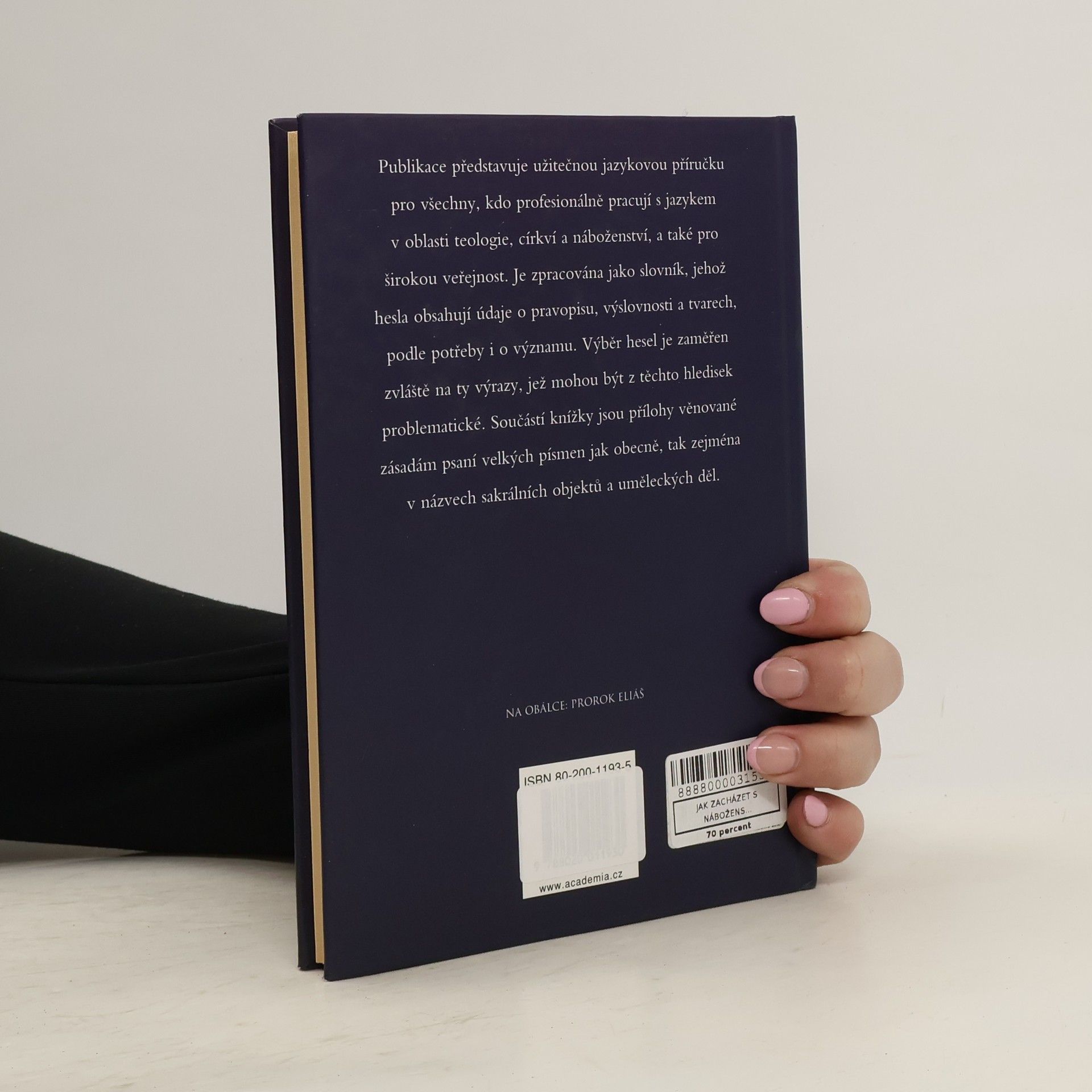 Publikace představuje užitečnou jazykovou příručku pro všechny, kdo profesionálně pracují s jazykem z oblasti teologie, církví a náboženství, a také pro širokou veřejnost. Je zpracována jako slovník, jehož hesla obsahují údaje o pravopisu, výslovnosti a tvarech, podle potřeby i o významu. Výběr hesel je zaměřen zvláště na ty výrazy, jež mohou být z těchto hledisek problematické. Součástí knížky jsou přílohy věnované zásadám psaní velkých písmen jak obecně, tak zejména v názvech sakrálních objektů a uměleckých děl.