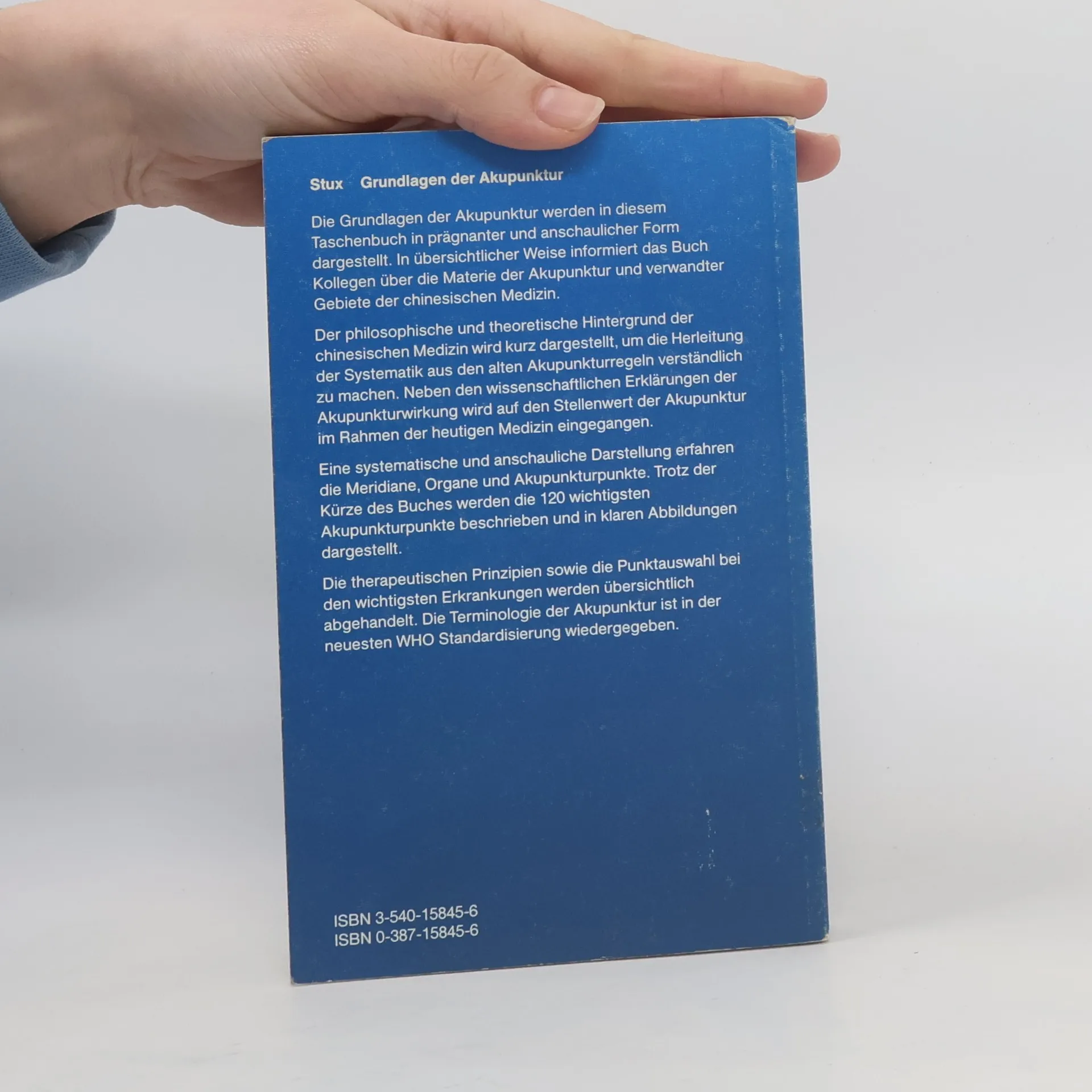 "Den Autoren ist es gelungen, einen aktuellen Leitfaden zu bieten, der einen raschen Einstieg in die Materie erlaubt und gleichzeitig notwendiges Grundwissen vermittelt. Das Buch kann allen Studenten und Ärzten empfohlen werden, die sich mit der Akupunktur befassen..." (Anaesthesiologie und Reanimation)"Das praxisorientierte und mit viel Liebe zum chinesischen Detail geschriebene Buch kann man nicht nur Anfängern, sondern auch erfahrenen Praktikern zum raschen Nachschlagen empfehlen." (Wiener klinische Wochenschrift)"Wer seine Lücken füllen möchte, kann getrost die handliche Einführung von G. Stux zu Rate ziehen, in der er einen Überblick über traditionelle und philosphische Hintergründe der Akupunktur gibt... Empfehlenswert ist vorliegendes Werk für jene Leser, die sich sowohl einen Einstieg in die theoretischen Hintergründe, Techniken und Anwendungsgebiete der Akupunktur verschaffen als auch ihre Möglichkeiten und Grenzen kennenlernen wollen... Das Buch besticht durch eine übersichtliche, anschauliche sowie knappe Gliederung und ist auch ohne spezielle Vorkenntnisse gut zu verstehen." (Therapiewoche)