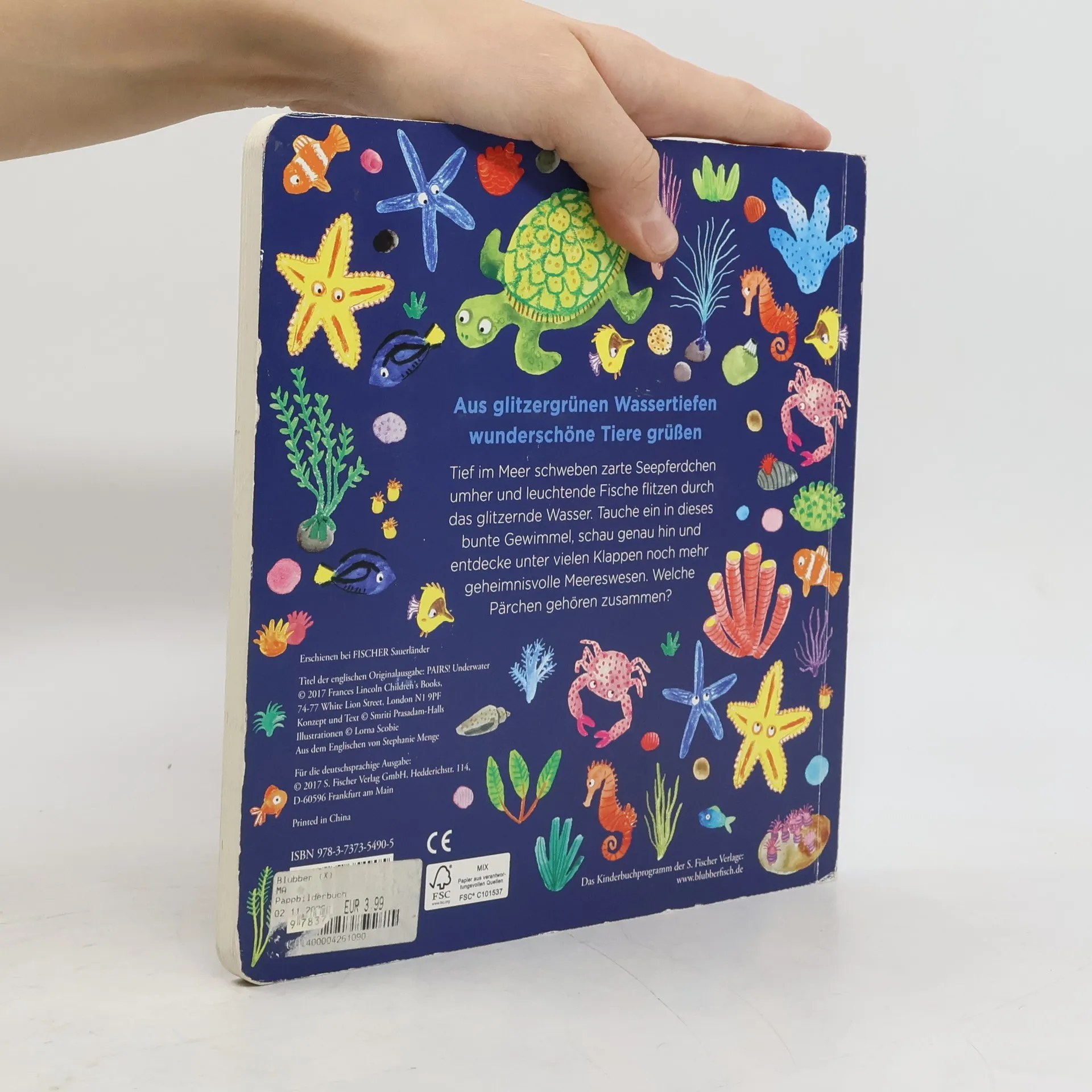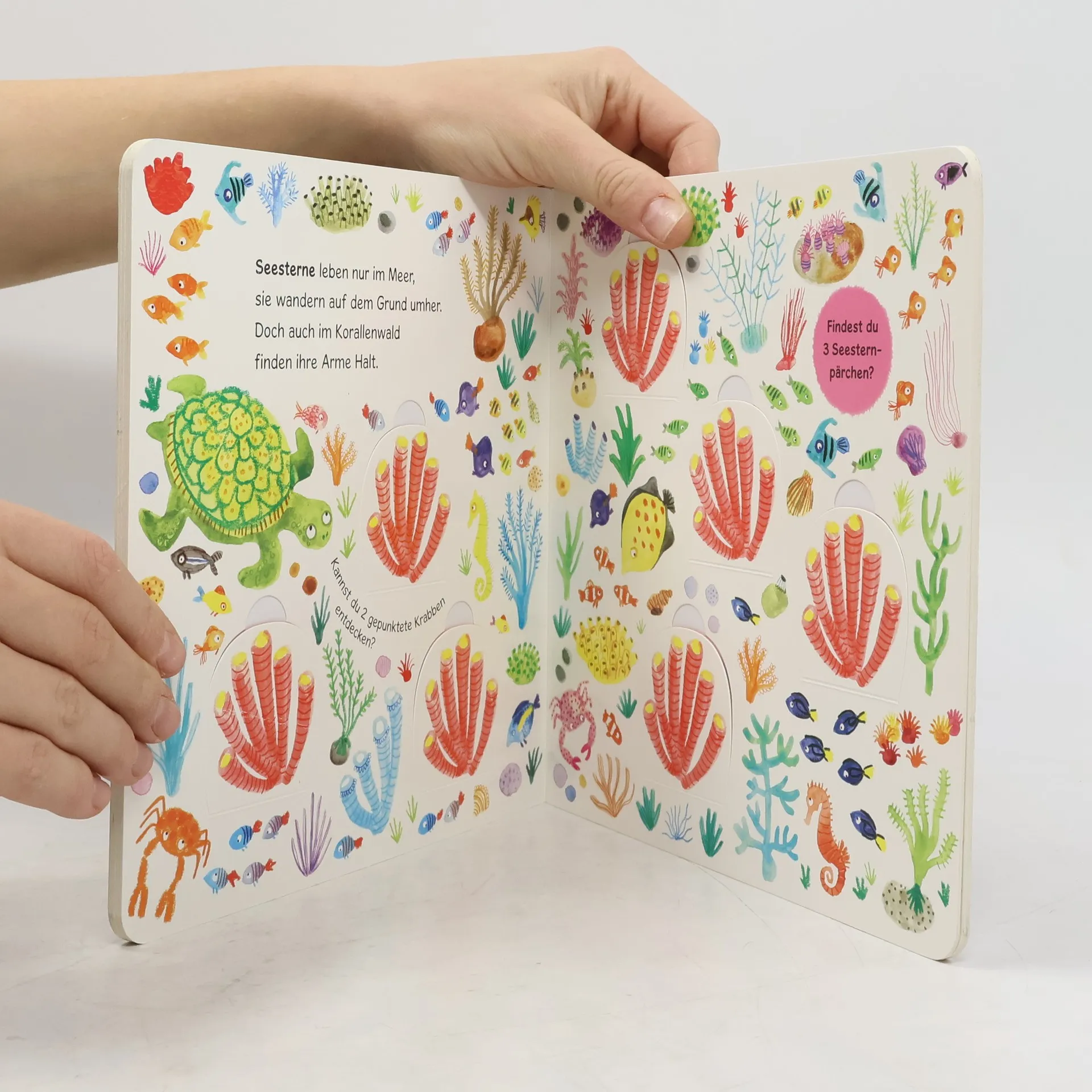 Fröhliches Gewimmel unter Wasser!Im Wasser schwimmen und schweben die schillerndsten Meeresbewohner! Farbenprächtige Seepferdchen, Fische und Muscheln gleiten vorbei. Bunte Korallenfelder und Meerespflanzen geben den Blick auf Krebse und Seesterne frei. Dieses stimmungsvolle Pappbilderbuch entführt Kinder in die bunte Unterwasserwelt! Insgesamt können 30 Klappen geöffnet werden, die das Buch zu einem tollen Memo-Spiel mit 18 Bildpaaren machen. Ein herrliches Spiel-Buch für Genau-Hingucker und kleine Meeresfreunde ab 3 Jahre.