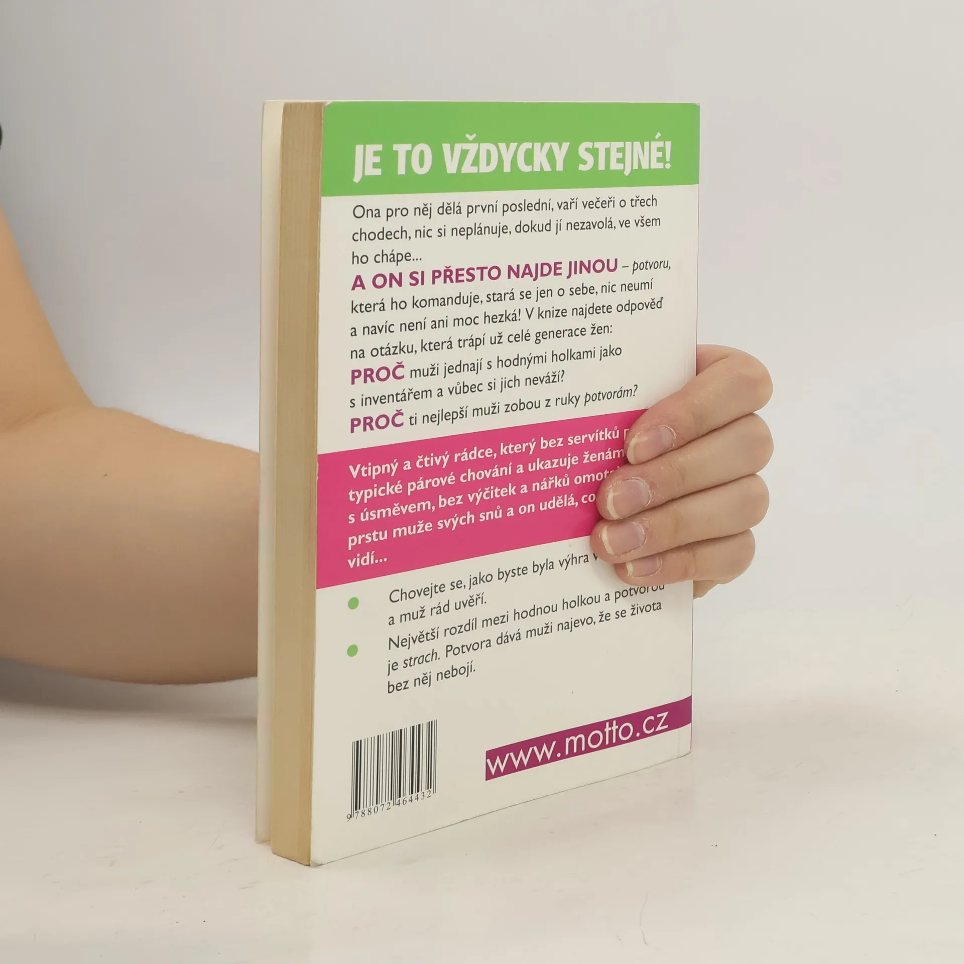 Vtipný a čtivý rádce, který bez servítku popisuje typické párové chování a ukazuje ženám, jak si s úsměvem, bez výčitek a nářku omotají kolem prstu muže svých snu a on udělá, co jim na očích vidí... Proč muži jednají s hodnými holkami jak s inventářem, ale zobou z ruky potvorám? Vtipná kniha, která otevřeně a bez zastírání popisuje typické párové chování. Poradí vám, jak si s úsměvem, bez výčitek a nářků, omotáte kolem prstu muže svých snů.
