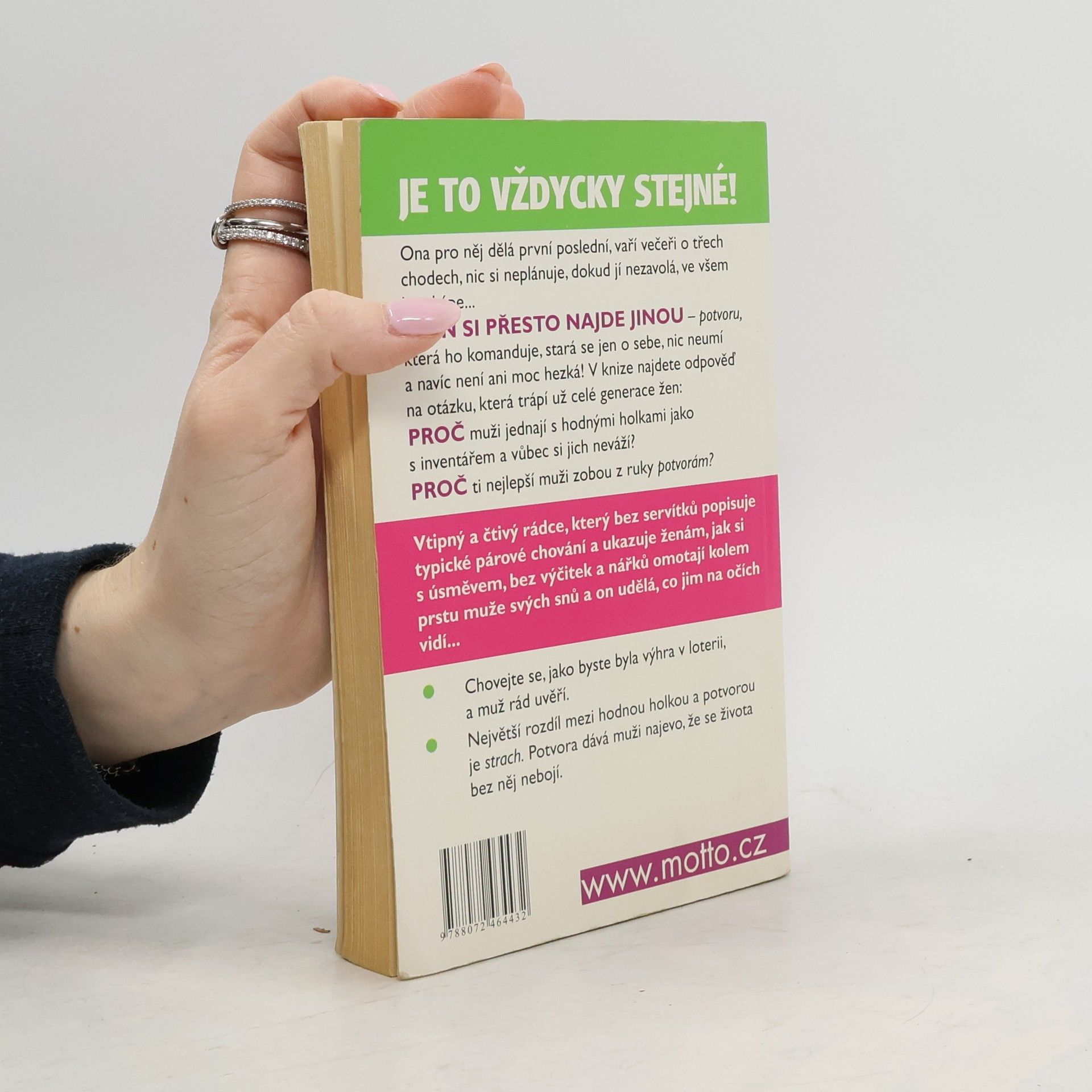 Vtipný a čtivý rádce, který bez servítku popisuje typické párové chování a ukazuje ženám, jak si s úsměvem, bez výčitek a nářku omotají kolem prstu muže svých snu a on udělá, co jim na očích vidí... Proč muži jednají s hodnými holkami jak s inventářem, ale zobou z ruky potvorám? Vtipná kniha, která otevřeně a bez zastírání popisuje typické párové chování. Poradí vám, jak si s úsměvem, bez výčitek a nářků, omotáte kolem prstu muže svých snů.