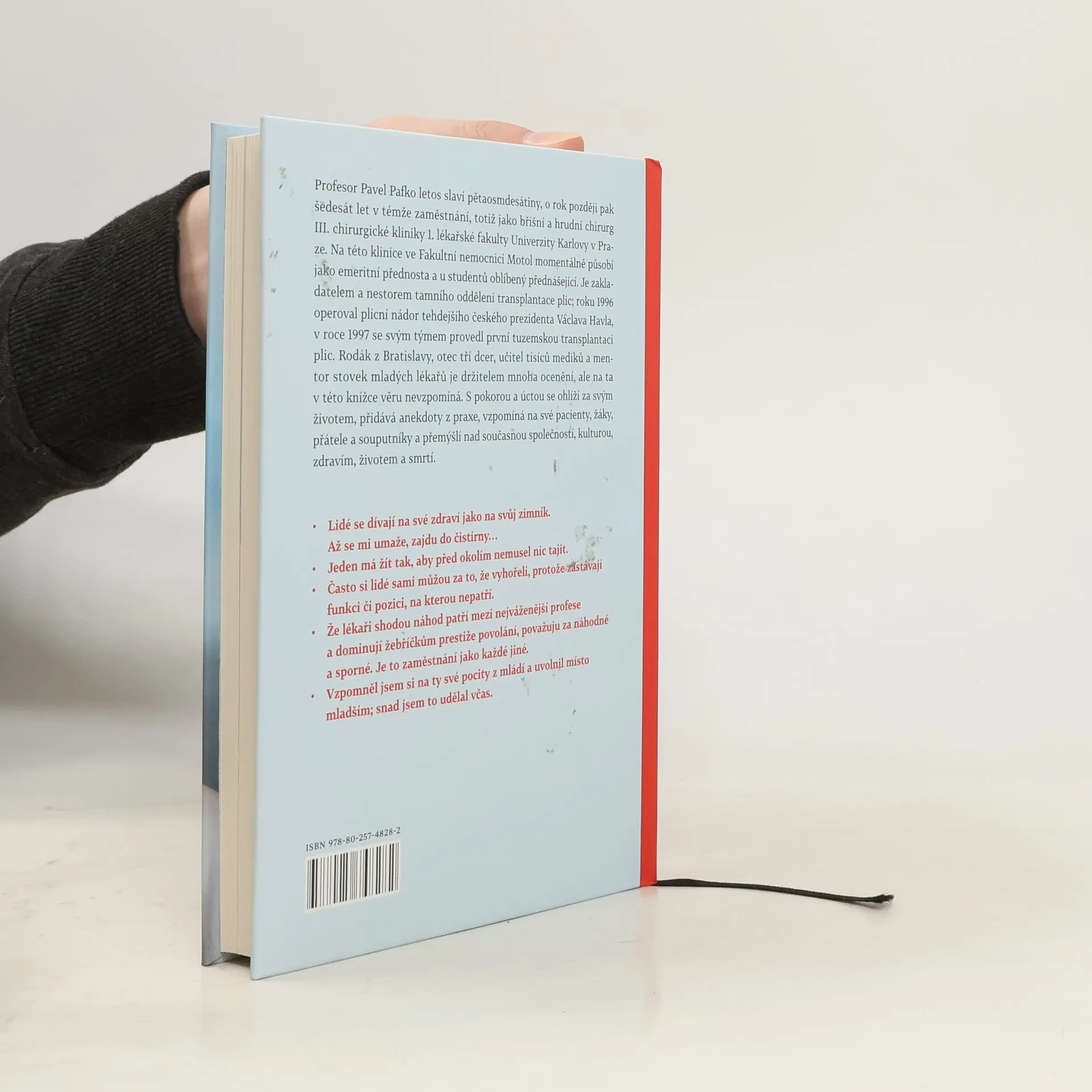 Profesor Pavel Pafko letos v červenci slaví pětaosmdesátiny, o rok později pak šedesát let v témže zaměstnání, totiž jako břišní a hrudní chirurg III. chirurgické kliniky 1. lékařské fakulty Univerzity Karlovy v Praze. Rodák z Bratislavy, otec tří dcer, učitel tisíců mediků a mentor stovek mladých lékařů je držitelem mnoha ocenění, ale na ta v této knížce věru nevzpomíná – ani na pocty, ani na zásluhy. „Vždycky jsem to bral tak, že věci plynuly a já si jen tak plul. Nikdy jsem neuvažoval o tom, zda jsem na vrcholu nebo jak se na něj vyškrábat,“ říká Pavel Pafko, který se touto publikací s pokorou a úctou ohlíží za svým životem, přidává anekdoty z praxe, vzpomíná na své pacienty, žáky, přátele a souputníky a přemýšlí nad současnou společností, veřejnou sférou, kulturou, zdravím, životem a smrtí.