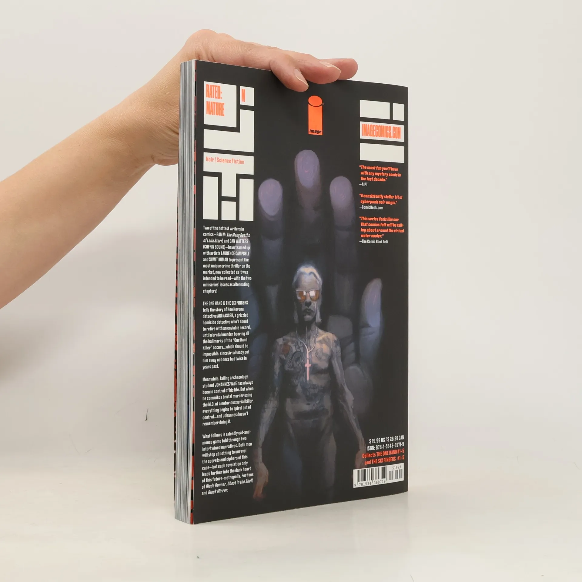 Two of the hottest writers in comics—RAM V and DAN WATTERS—have teamed up with artists LAURENCE CAMPBELL and SUMIT KUMAR to tell the most unique crime thriller, now collected in the manner it was intended to be read in—with the miniseries issues as alternating chapters! THE ONE HAND tells the story of Neo Novena detective, ARI NASSER—a grizzled homicide detective who’s about to retire with an enviable record, until a brutal murder occurs bearing all the hallmarks of the "One Hand Killer"…which should be impossible since Ari already put him away not once but twice in years past. In THE SIX FINGERS, Neo Novena archaeology student, JOHANNES VALE has always been so very in control of his life. But when he commits a brutal murder using the M.O. of a historic and notorious serial killer, everything begins to spiral out of control…and Johannes doesn’t remember doing it. What follows is a deadly cat-and-mouse game told through two intertwined narratives. Both men will stop at nothing to unravel the secrets and ciphers of this case—but each revelation only leads further into the dark heart of this future-metropolis. Collects THE ONE HAND #1-5 and THE SIX FINGERS #1-5