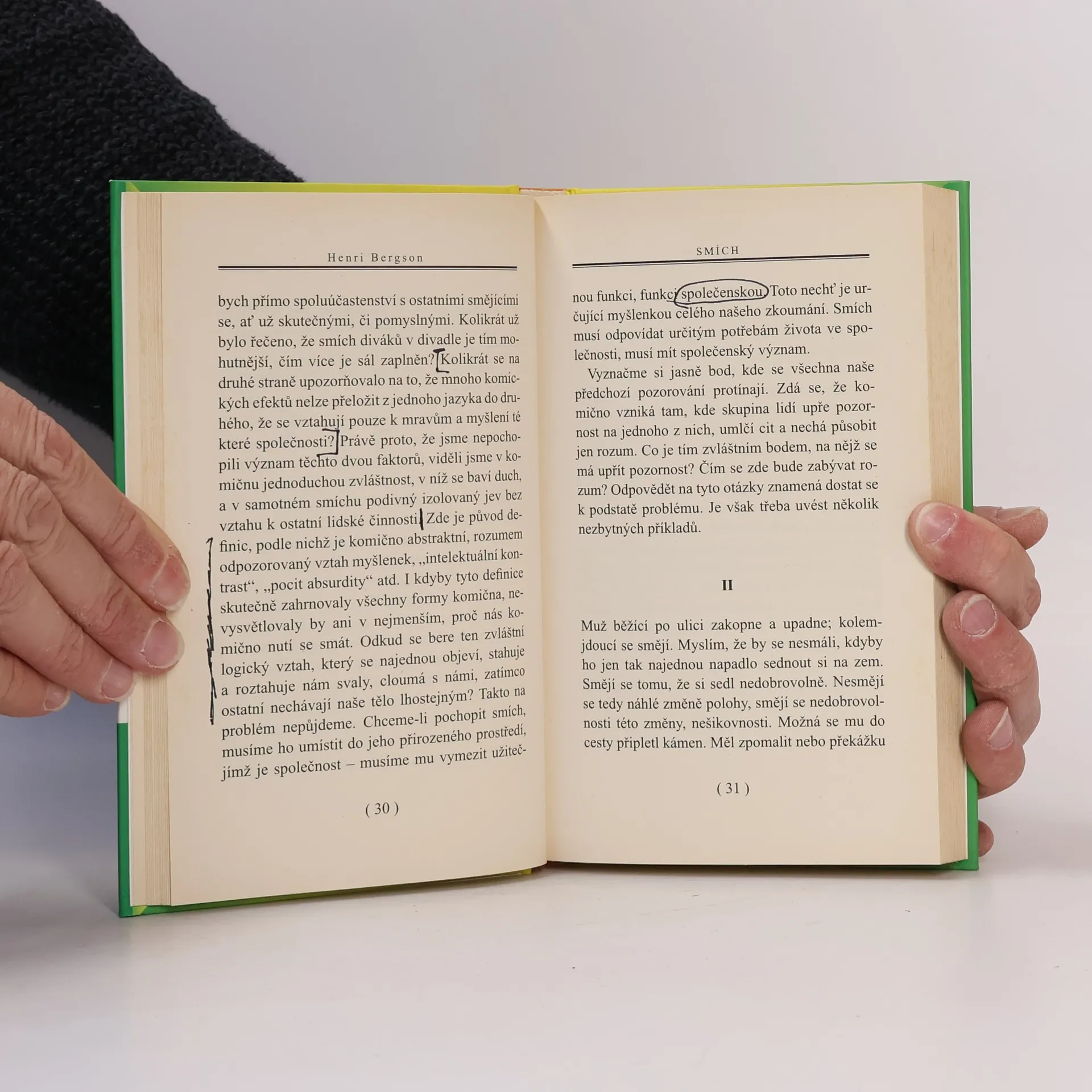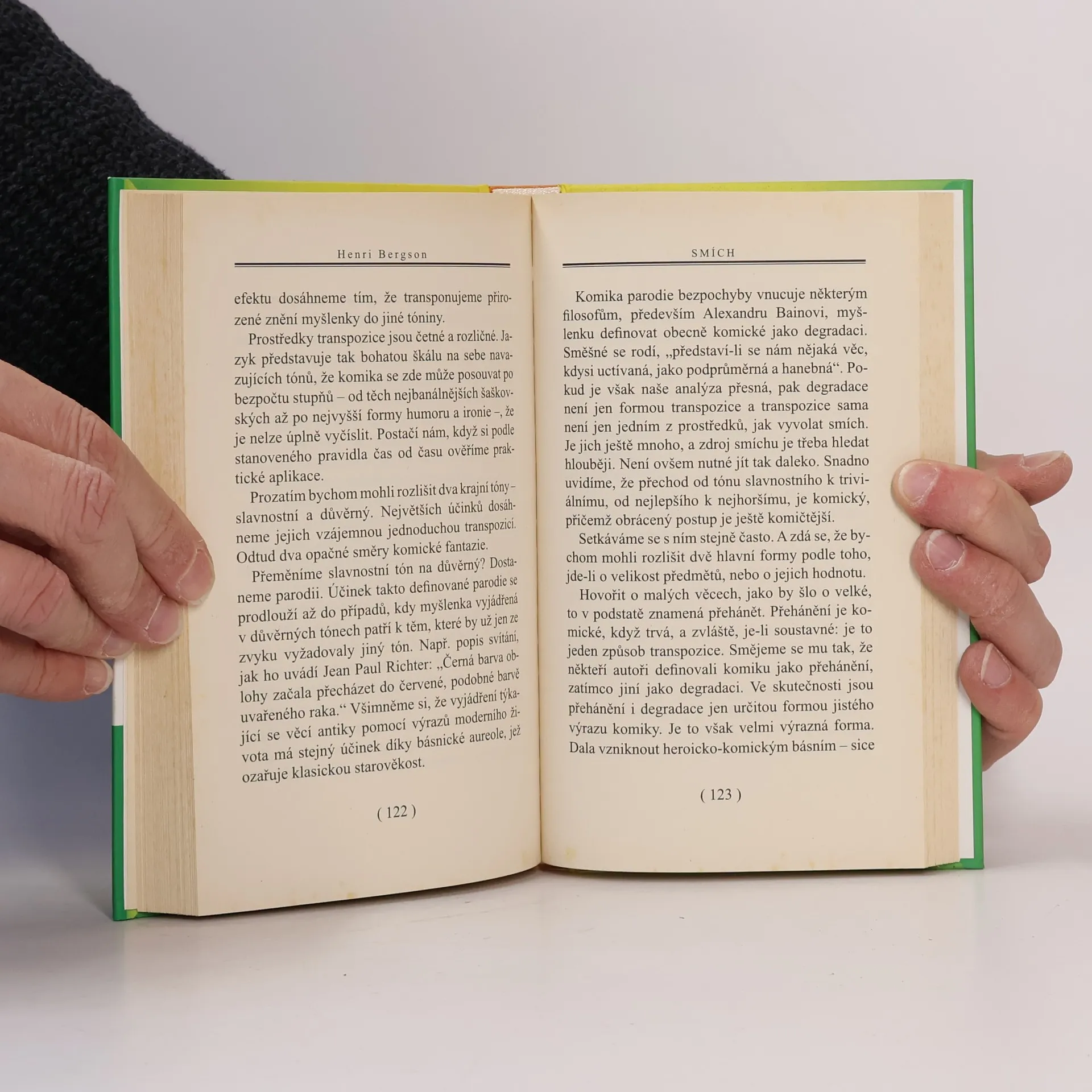 Proslulá Bergsonova esej Smích se zamýšlí nad otázkou zdroje a smyslu smíchu. Odpověď zní, že plní závažnou společenskou roli. Kriticky totiž reaguje na vše komické, tj. na to, co vyjadřuje strnulé, mechanické stránky lidského myšlení a chování. Autor se zde projevuje nejen jako dobrý znalec literatury, ale též jako mistrný a vtipný pozorovatel každodenního života.