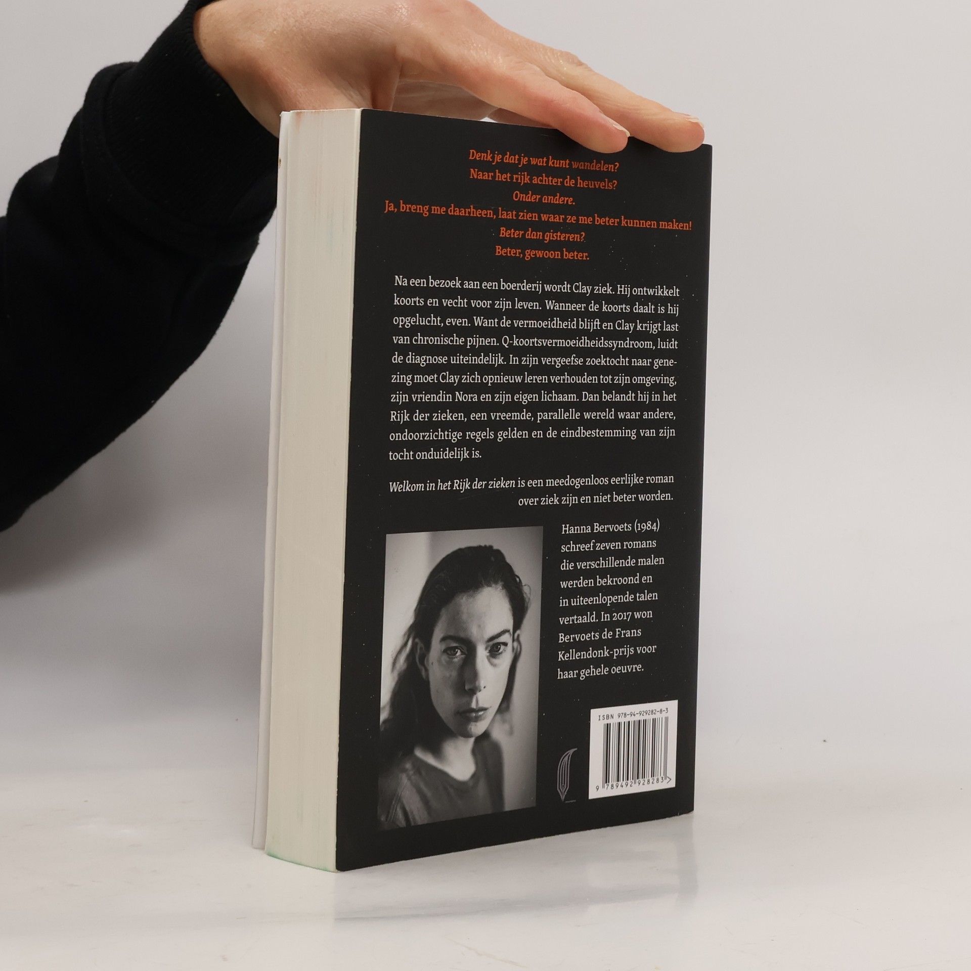 Na een bezoek aan een boerderij wordt Clay ziek. Hij ontwikkelt koorts en vecht voor zijn leven. Wanneer de koorts daalt is hij opgelucht, even. Want de vermoeidheid blijft en Clay krijgt last van chronische pijnen. Q-koortsvermoeidheidssyndroom, luidt de diagnose uiteindelijk. In zijn vergeefse zoektocht naar genezing moet Clay zich opnieuw leren verhouden tot zijn omgeving, zijn vriendin Nora en zijn eigen lichaam. Dan belandt hij in het Rijk der zieken, een vreemde, parallelle wereld waar andere, ondoorzichtige regels gelden en de eindbestemming van zijn tocht onduidelijk is. Welkom in het Rijk der zieken is een meedogenloos eerlijke roman over ziek zijn en niet beter worden. Hanna Bervoets over Welkom in het Rijk der zieken ‘Verhalen over ziek zijn fascineren me. Veel fictie – romans, films – over ziekte kent een helder verloop: de held wordt ziek, takelt af, vecht voor zijn leven en sterft – of niet. Het zijn krachtige vertellingen over lijden en zingeving, maar, vroeg ik me de afgelopen jaren steeds vaker af, waarom zijn er zo weinig verhalen over chronisch ziek zijn? Over patiënten die niet aan hun aandoening zullen bezwijken maar ook nooit zullen genezen; mensen met klachten die hen hun hele leven zullen blijven plagen. Welk verhaal valt dáár over te vertellen? Welkom in het Rijk der zieken is een roman over ziek zijn en nooit meer beter worden. De afgelopen jaren heb ik veel mensen met aanhoudende klachten ontmoet. Ze kampen met reuma, de ziekte van Lyme, ME, chronische pijn of de gevolgen van zware operaties na ongelukken of kanker. De diagnoses verschillen, de klachten van deze mensen zijn hetzelfde: chronische pijn, chronische vermoeidheid. Ik ontmoette patiënten die zich afvroegen of hun leven nog wel de moeite waard is, hoe ze verder moeten met de wetenschap dat ze dag en nacht pijn zullen voelen. Clay, het hoofdpersonage van Welkom in het Rijk der zieken kreeg de diagnose Q-koortsvermoeidheidssyndroom, maar zijn symptomen komen overeen met die van veel andere aandoeningen. Zijn queeste is geen zoektocht naar genezing, misschien niet eens naar acceptatie. Veel meer is het een poging een verhaal over zijn nieuwe bestaan te maken. Daarmee is Welkom in het Rijk der zieken een emigratieverhaal van het Rijk der gezonden naar het Rijk der zieken, over wat we achterlaten wanneer we de controle over ons lichaam verliezen. Maar ook over waar we dan naartoe gaan.’