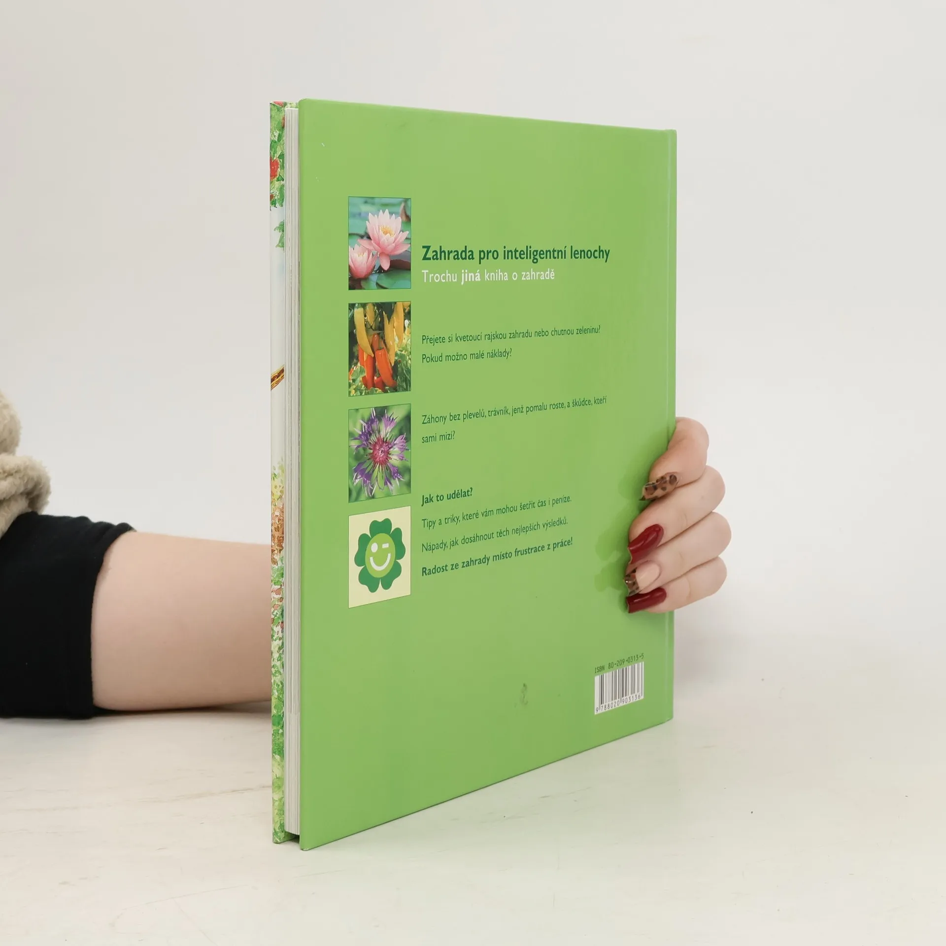 inteligentní nápady pro "lenivé zahrádkáře". Rady, jak si založit zahradu při minimální potřebě času a peněz. Velmi zajímavá, nápaditá a hezká kniha se spoustou obrázků a fotografií je určena majitelům zahrad, kteří chtějí mít hezkou zahradu a při tom na ní netrávit mnoho času, nevěnovat jí mnoho energie a peněz. Rady, jak založit takovou zahradu, nechávají také prostor volně žijícím rostlinám a živočichům a soužití s přírodou bez chemie. Kromě obecných rad pro zakládání zahrady a její udržování, najdeme v knize nápady pro zahradu okrasnou, užitkovou, dětskou a balkonovou, pro zelené stěny a střechy, také kalendář pro celý zahrádkářův rok apod.