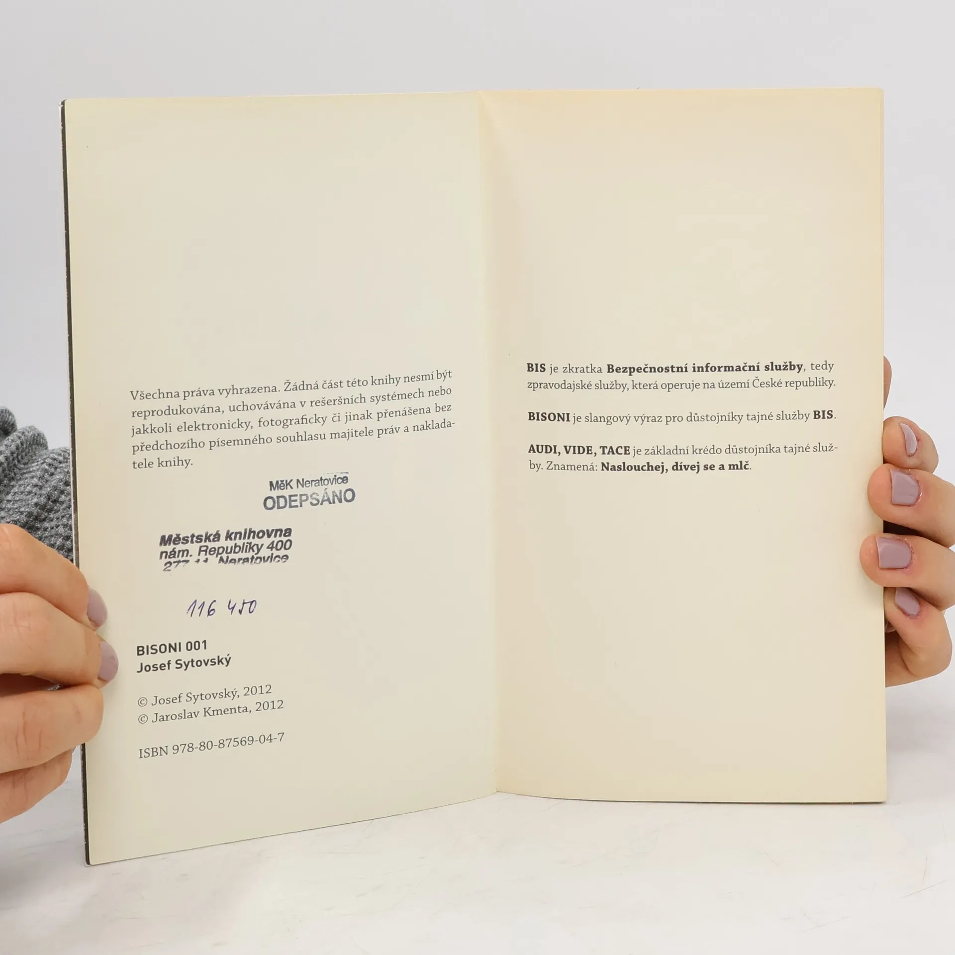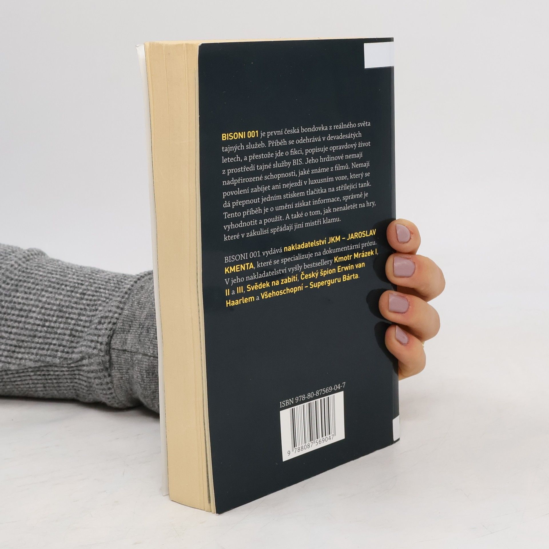 BISONI 001 je první česká bondovka z reálného světa tajných služeb. Příběh se odehrává v devadesátých letech, a přestože jde o fikci, popisuje opravdový život z prostředí tajné služby BIS. Jeho hrdinové nemají nadpřirozené schopnosti, jaké známe z filmů. Nemají povolení zabíjet ani nejezdí v luxusním voze, který se dá přepnout jedním stiskem tlačítka na střílející tank. Tento příběh je o umění získat informace, správně je vyhodnotit a použít. A také o tom, jak nenaletět na hry, které v zákulisí spřádají jiní mistři klamu. BISONI 001 vydává nakladatelství JKM – JAROSLAV KMENTA, které se specializuje na dokumentární prózu. V jeho nakladatelství vyšly bestsellery Kmotr Mrázek I, II a III, Svědek na zabití, Český špion Erwin van Haarlem a Všehoschopní – Superguru Bárta.