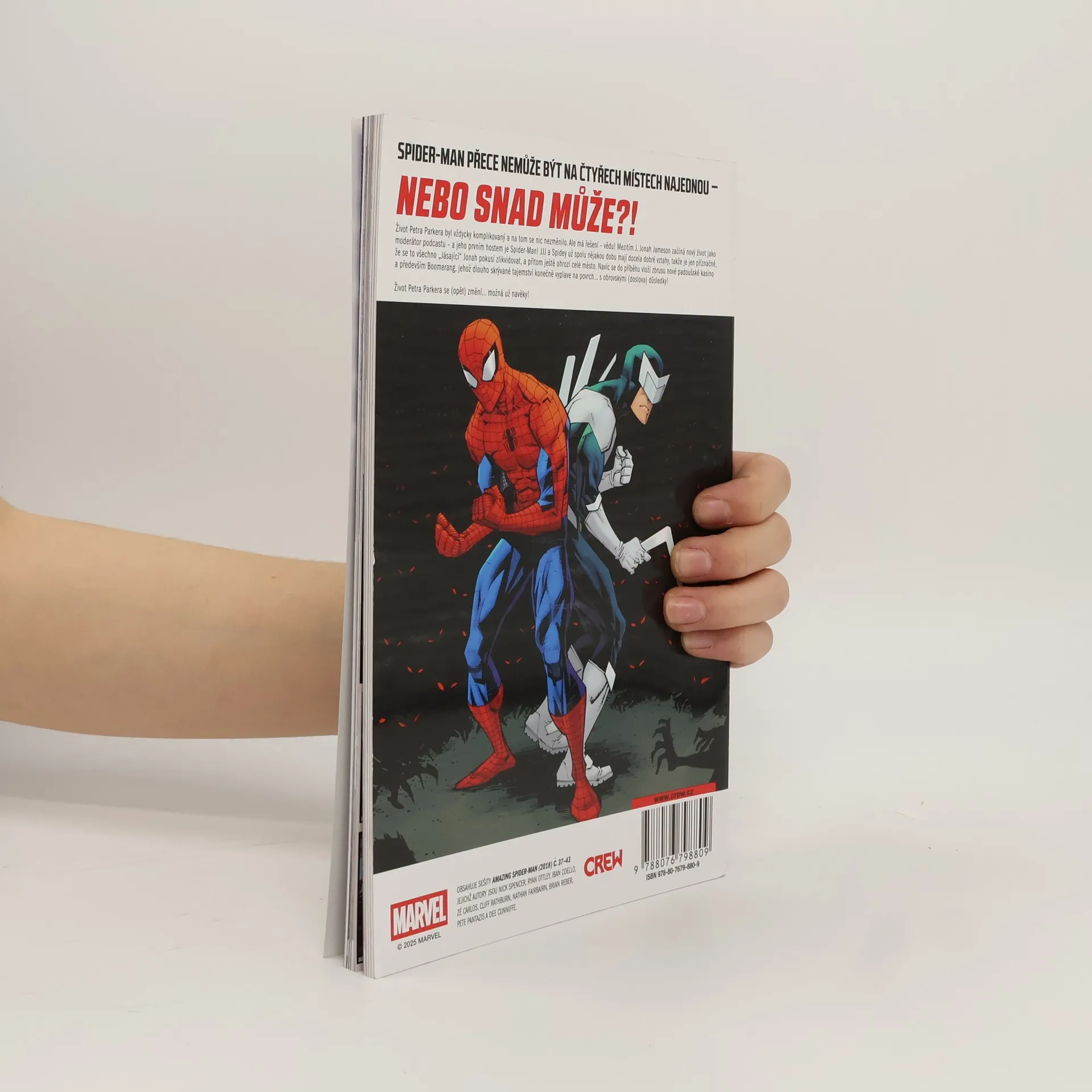 Život Petra Parkera byl vždycky komplikovaný a na tom se nic nezměnilo. Ale má řešení – vědu! Mezitím J. Jonah Jameson začíná nový život jako moderátor podcastu – a jeho prvním hostem je Spider-Man! JJJ a Spidey už spolu nějakou dobu mají docela dobré vztahy, takže je jen příznačné, že se to všechno „Jásající“ Jonah pokouší zlikvidovat, a přitom ještě ohrozí celé město. Navíc se do příběhu vloží zbrusu nové padoušské kasino a především Boomerang, jehož dlouho skrývané tajemství konečně vyplave napovrch… s obrovskými (doslova) důsledky! Život Petra Parkera se (opět) změní... možná už navěky! OBSAHUJE SEŠITY AMAZING SPIDER-MAN (2018) C. 37–43 JEJICHŽ AUTORY JSOU NICK SPENCER, RYAN OTTLEY, IBAN COELLO, ZÉ CARLOS, CLIFF RATHBURN, NATHAN FAIRBAIRN, BRIAN REBER, PETE PANTAZIS A DEE CUNNIFEE.