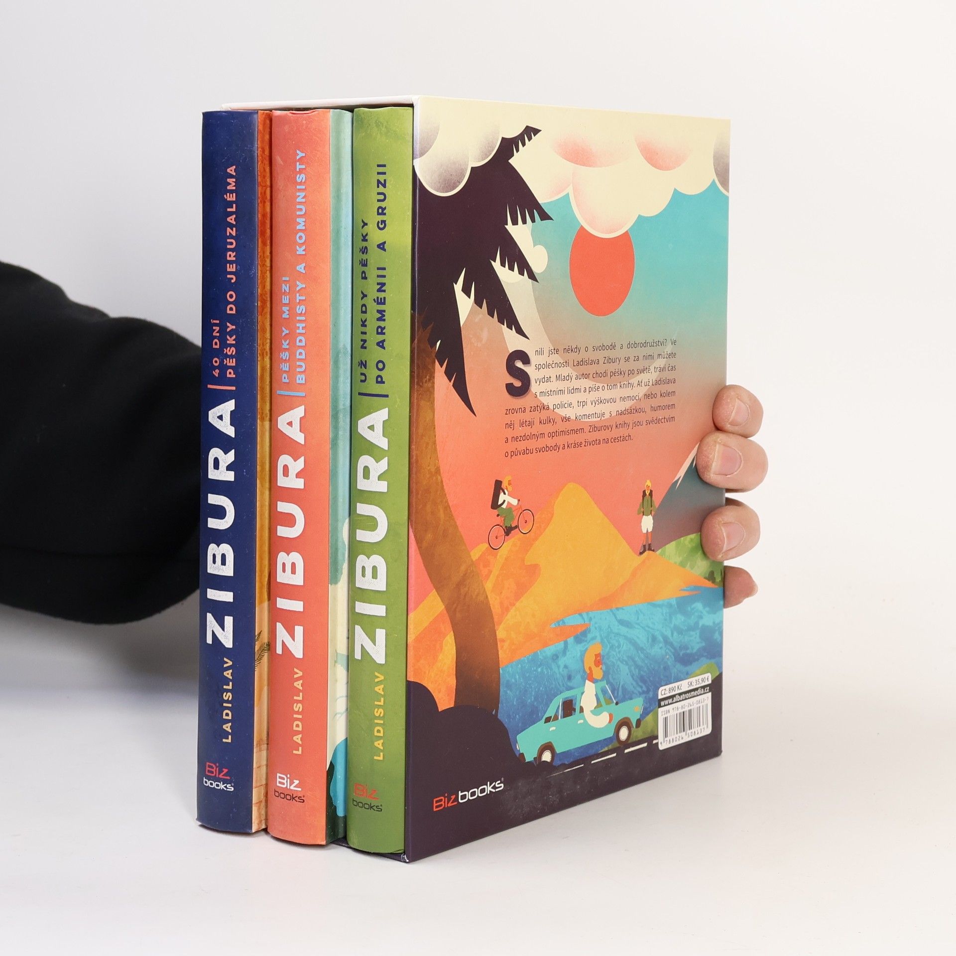 Rádi objevujete a sníte o dalekých cestách? Vydejte se za svobodou ve společnosti Ladislava Zibury. Mladý autor chodí pěšky světem, tráví čas s hodnými lidmi a pátrá po dobrodružství. Své cesty líčí s nadsázkou, humorem a nakažlivým optimismem. Ziburovy knihy jsou díky tomu svědectvím opůvabu svobody a kráse života na cestách. Zasněte se u nich a nechte si vyprávět příběhy ze světa mnohem lepšího, než je ten v televizi. V dárkovém trojboxu najdete tři knížky – 40 dní pěšky do Jeruzaléma, Pěšky mezi buddhisty a komunisty, Už nikdy pěšky po Arménii a Gruzii plus pexeso na motivy ilustrací ze Ziburových knih z dílny ilustrátorského dua Tomski & Polanski.