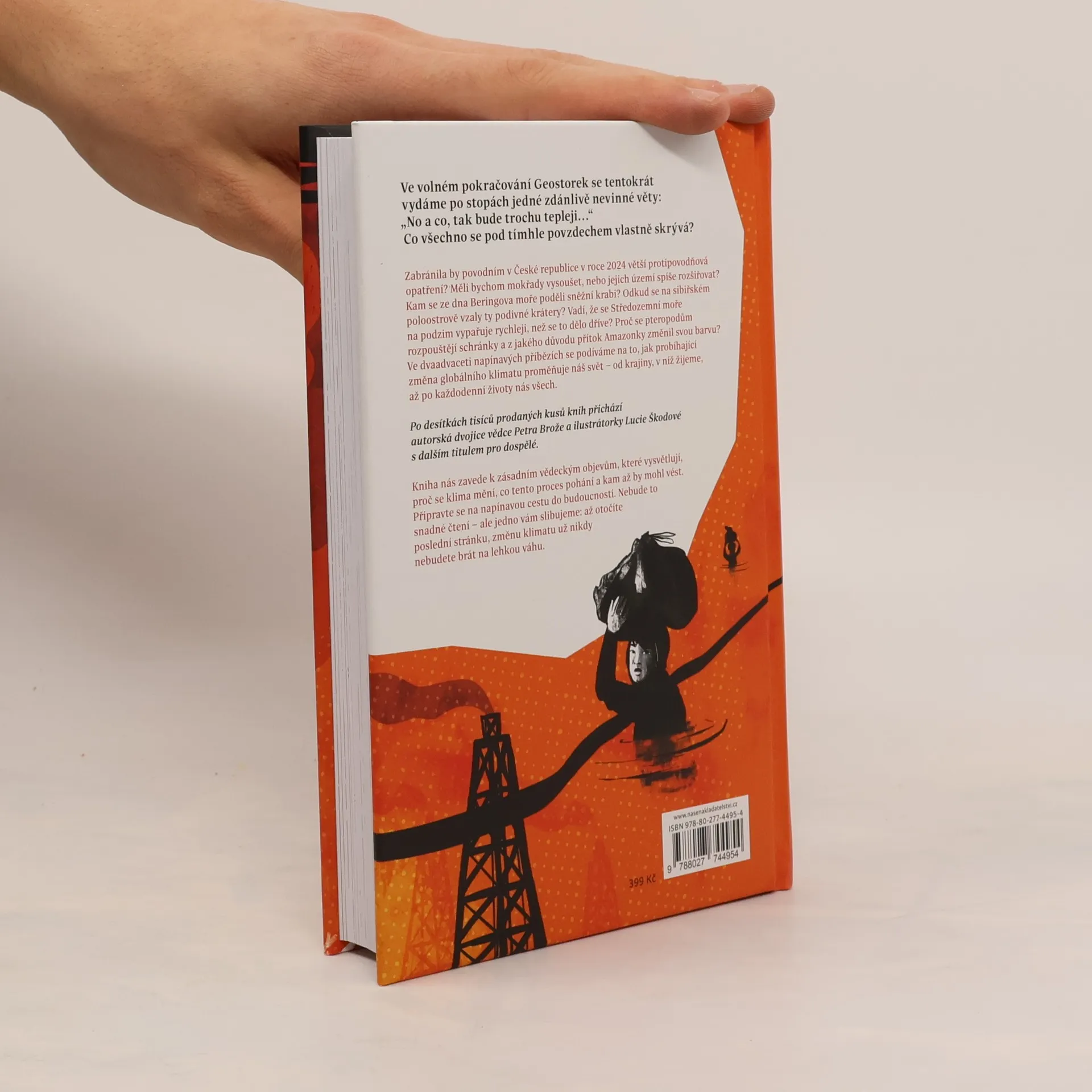Ve volném pokračování Geostorek se tentokrát vydáme po stopách jedné zdánlivě nevinné věty: „No a co, tak bude trochu tepleji…“ Co všechno se ale pod tímhle povzdechem skrývá?Zabránily by povodním v České republice v roce 2024 větší protipovodňová opatření? Měli bychom mokřady vysoušet, nebo jejich území spíše rozšiřovat? Kam se ze dna Beringova moře poděli sněžní krabi? Odkud se na sibiřském poloostrově vzaly ty podivné krátery? Vadí, že se Středozemní moře na podzim vypařuje rychleji, než se to dělo dříve? Proč se pteropodům rozpouštějí schránky a z jakého důvodu přítok Amazonky změnil svou barvu?Ve dvaadvaceti napínavých příbězích se podíváme na to, jak probíhající změna globálního klimatu proměňuje náš svět – od krajiny, v níž žijeme, až po každodenní životy nás všech.Po desítkách tisíců prodaných kusů svých knih přichází autorská dvojice vědce Petra Brože a ilustrátorky Lucie Škodové s dalším titulem pro dospělé.Kniha nás zavede k zásadním vědeckým objevům, které vysvětlují, proč se klima mění, co tento proces pohání a kam až by mohl vést. Připravte se na napínavou cestu do budoucnosti. Nebude to snadné čtení – ale jedno vám slibujeme: až otočíte poslední stránku, změnu klimatu už nikdy nebudete brát na lehkou váhu.