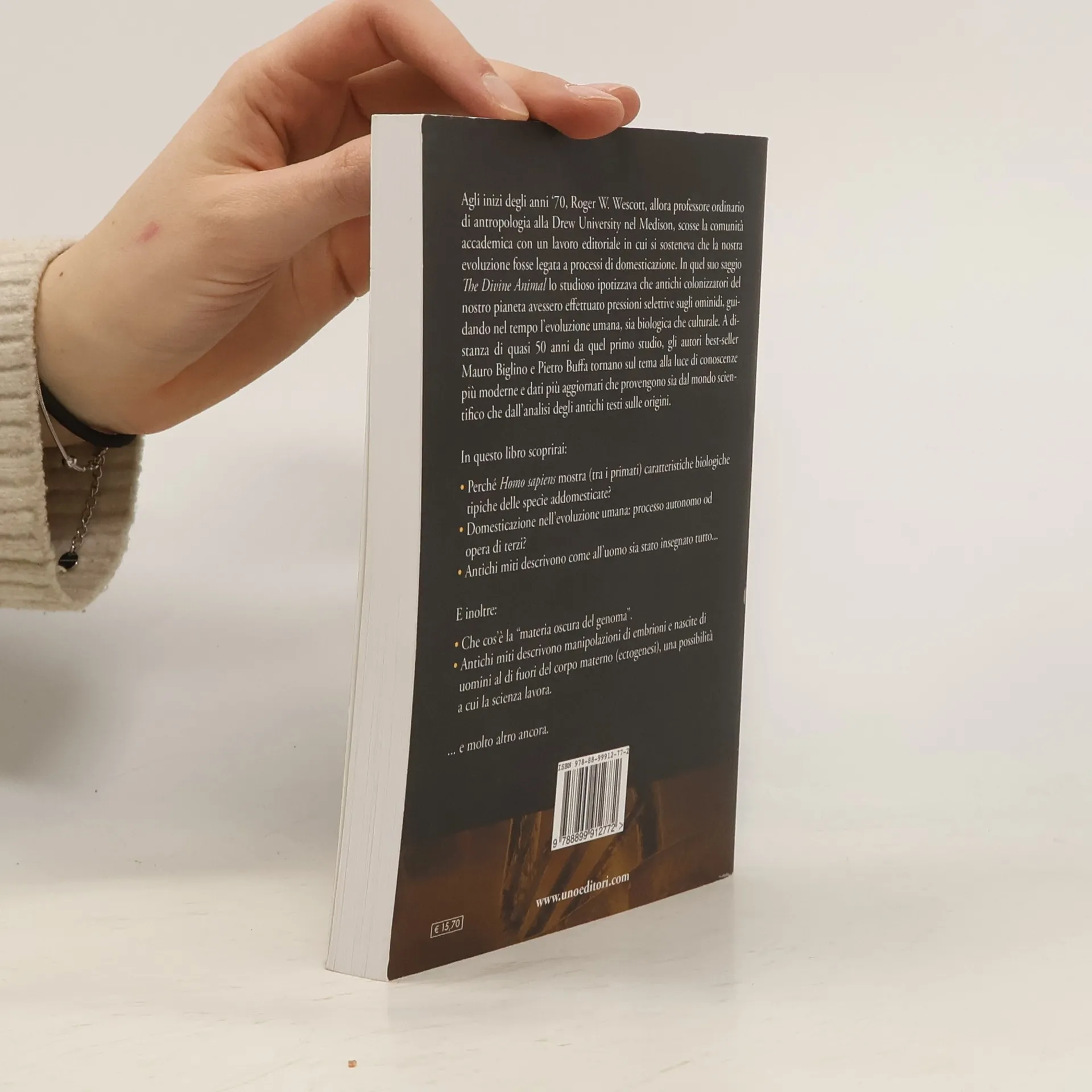 Agli inizi degli anni '70, Roger W. Wescott, allora professore ordinario di antropologia alla Drew University nel Medison, scosse la comunità accademica con un lavoro editoriale in cui si sosteneva che la nostra evoluzione fosse legata a processi di domesticazione. In quel suo saggio «The Divine Animal» lo studioso ipotizzava che antichi colonizzatori del nostro pianeta avessero effettuato pressioni selettive sugli ominidi, guidando nel tempo l'evoluzione umana, sia biologica che culturale. A distanza di quasi 50 anni da quel primo studio, gli autori Mauro Biglino e Pietro Buffa tornano sul tema alla luce di conoscenze più moderne e dati più aggiornati che provengono sia dal mondo scientifico che dall'analisi degli antichi testi sulle origini.In questo libro scoprirai:Perché Homo sapiens mostra (tra i primati) caratteristiche biologiche tipiche delle specie addomesticate? Domesticazione nell’evoluzione umana: processo autonomo od opera di terzi?Antichi miti descrivono come all’uomo sia stato insegnato tutto...All’interno del genoma per comprendere cosa ci ha reso umani e cosa è la “materia oscura del genoma”.Antichi miti descrivono manipolazioni di embrioni e nascite di uomini al di fuori del corpo materno (ectogenesi), una possibilità a cui la scienza lavora.