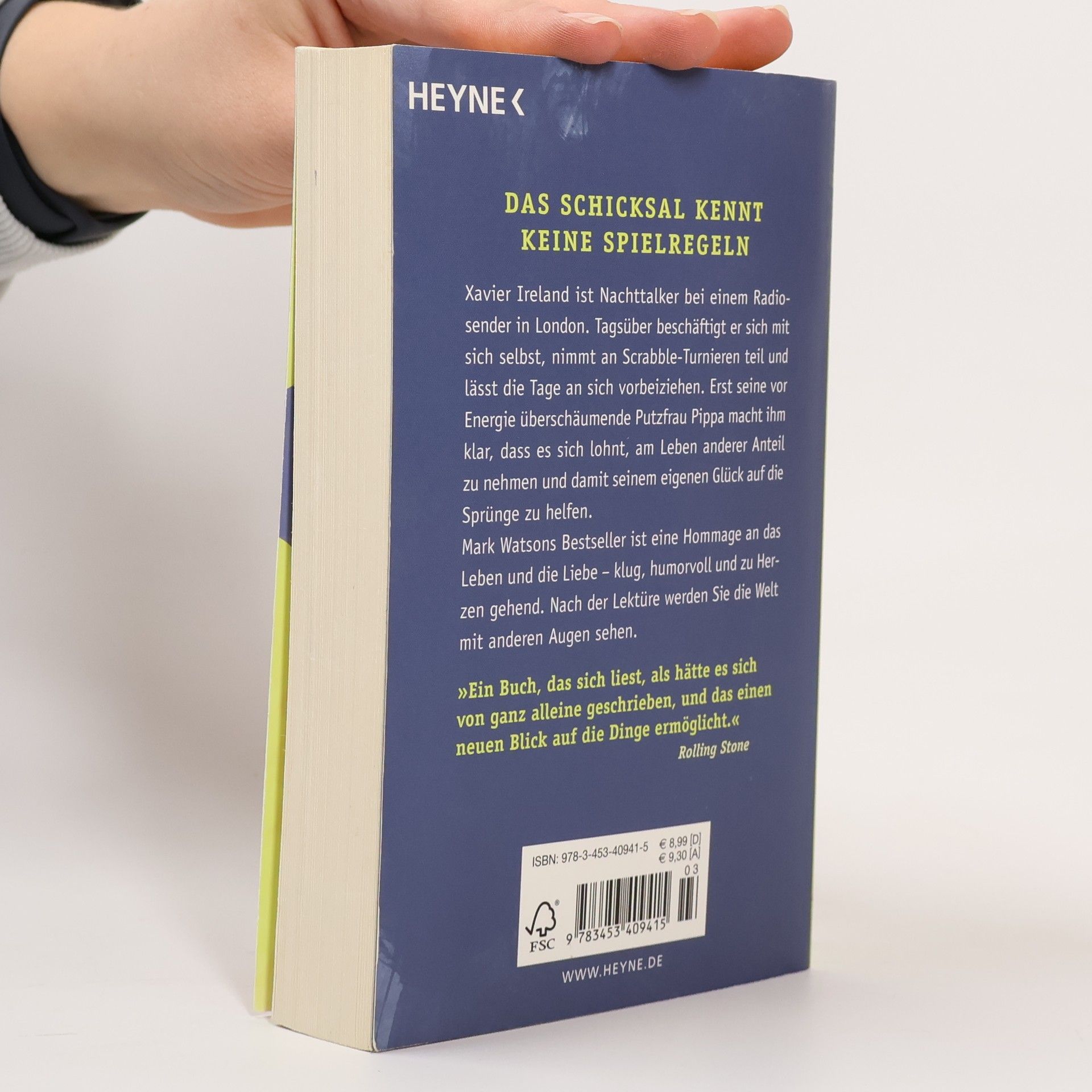 Das Schicksal kennt keine Spielregeln Xavier Ireland ist Nachttalker bei einem Radiosender in London. Tagsüber beschäftigt er sich mit sich selbst, nimmt an Scrabble-Turnieren teil und lässt die Tage an sich vorbeiziehen. Erst seine vor Energie überschäumende Putzfrau Pippa macht ihm klar, dass es sich lohnt, am Leben anderer Anteil zu nehmen und damit seinem eigenen Glück auf die Sprünge zu helfen. Mark Watsons Bestseller ist eine Hommage an das Leben und die Liebe – klug, humorvoll und zu Herzen gehend. Nach der Lektüre werden Sie die Welt mit anderen Augen sehen. Als gebundene Ausgabe unter dem Titel „Elf Leben“ im Eichborn Verlag erschienen.