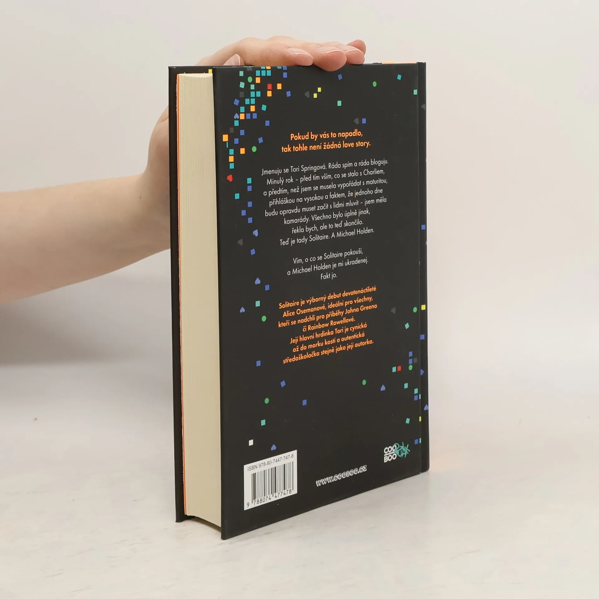 Pokud by vás to napadlo, tak tohle není žádná love story. Jmenuju se Tori Springová. Ráda spím a ráda bloguju. Minulý rok – před tím vším, co se stalo s Charliem a předtím, než jsem se musela vypořádat s maturitou a přihláškou na vysokou a faktem, že jednoho dne opravdu budu muset začít s lidmi mluvit – jsem měla kamarády. Všechno bylo úplně jinak, řekla bych, ale to teď skončilo. Teď je tady Solitaire. A Michael Holden. Vím, o co se Solitaire pokouší a Michael Holden je mi ukradenej. Fakt jo. Solitaire je výborný debut devatenáctileté Alice Osemanové, ideální pro všechny, kteří se nadchli pro příběhy Johna Greena či Rainbow Rowellové. Její hlavní hrdinka Tori je cynická až do morku kostí a autentická středoškolačka stejně jako její autorka.