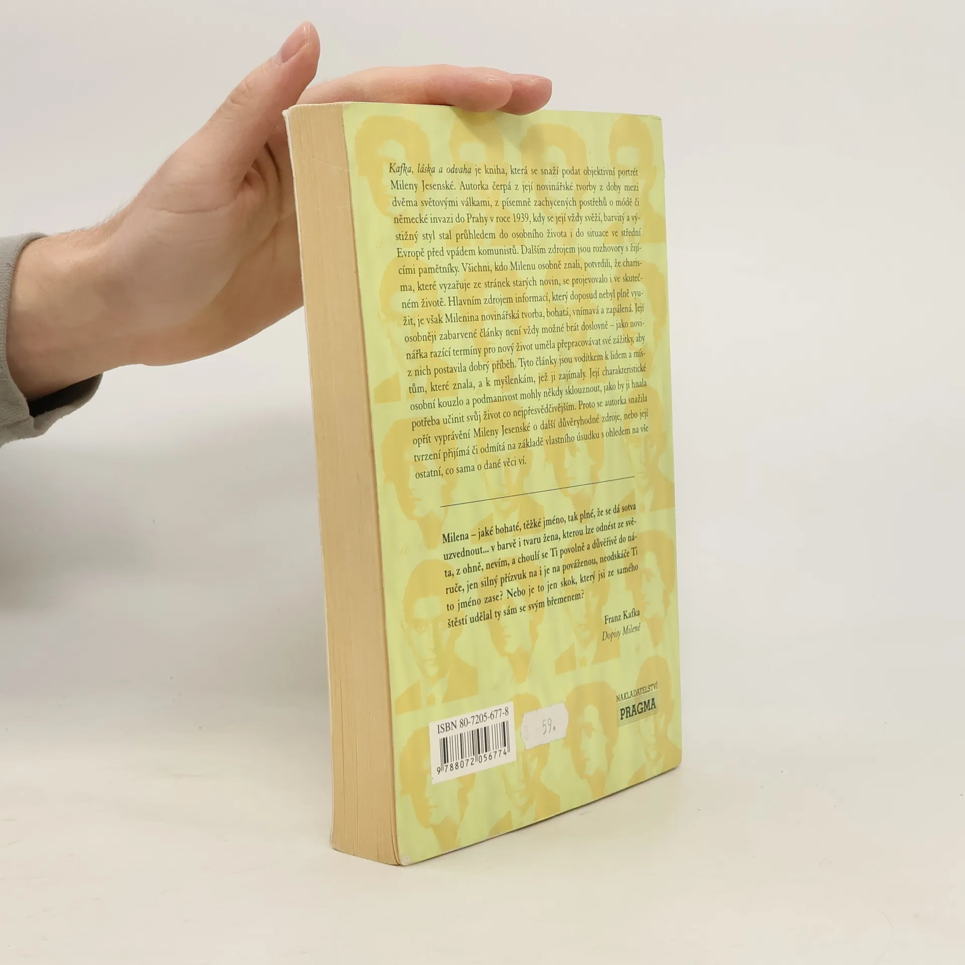 Kniha se snaží podat objektivní portrét Mileny Jesenské. Autorka čerpá z její novinářské tvorby z doby mezi dvěma světovými válkami, z písemně zachycených postřehů o módě či německé invazi do Prahy v roce 1939. Dalším zdrojem jsou rozhovory s žijícími pamětníky.
