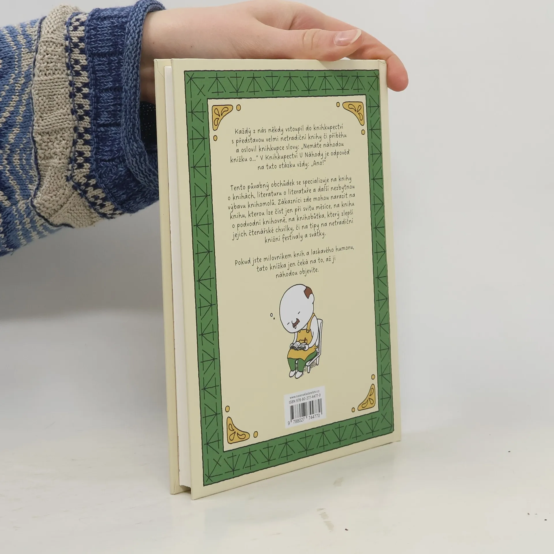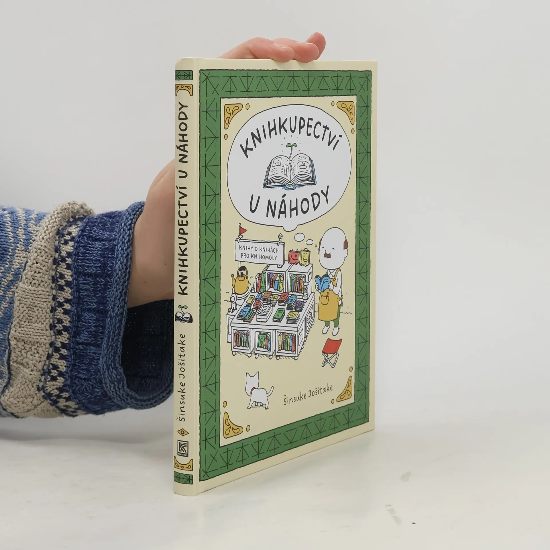 Šinsuke Jošitake, populární japonský autor dětských obrázkových knih, přichází s prvním titulem pro čtenáře dospělejšího věku, který potěší každého správného knihomola a ponoukne k tvůrčí představivosti. Vypráví příběhy knížek z Knihkupectví U Náhody. Toto knihkupectví totiž není ledajaké. Specializuje se na knihy o knihách a ty pojednávají o leckdy takřka neuvěřitelných knižních úkazech. Chcete se dozvědět, proč jsou knihy hranaté? Jak naplánovat svatbu pro pár knihomolů? Nehledáte náhodou knihu, kterou si můžete číst pouze za svitu měsíce? Či knihu, ve které najdete návod, jak zasadit strom, na kterém budou růst knihy? Dočtete se ledacos i o knižních svátcích a festivalech, které se konají po celém světě. Zkrátka není náhodou, že ať už v Knihkupectví U Náhody hledáte jakoukoliv knihu, téměř vždy se vám dostane jediné odpovědi: „Tu náhodou máme!“