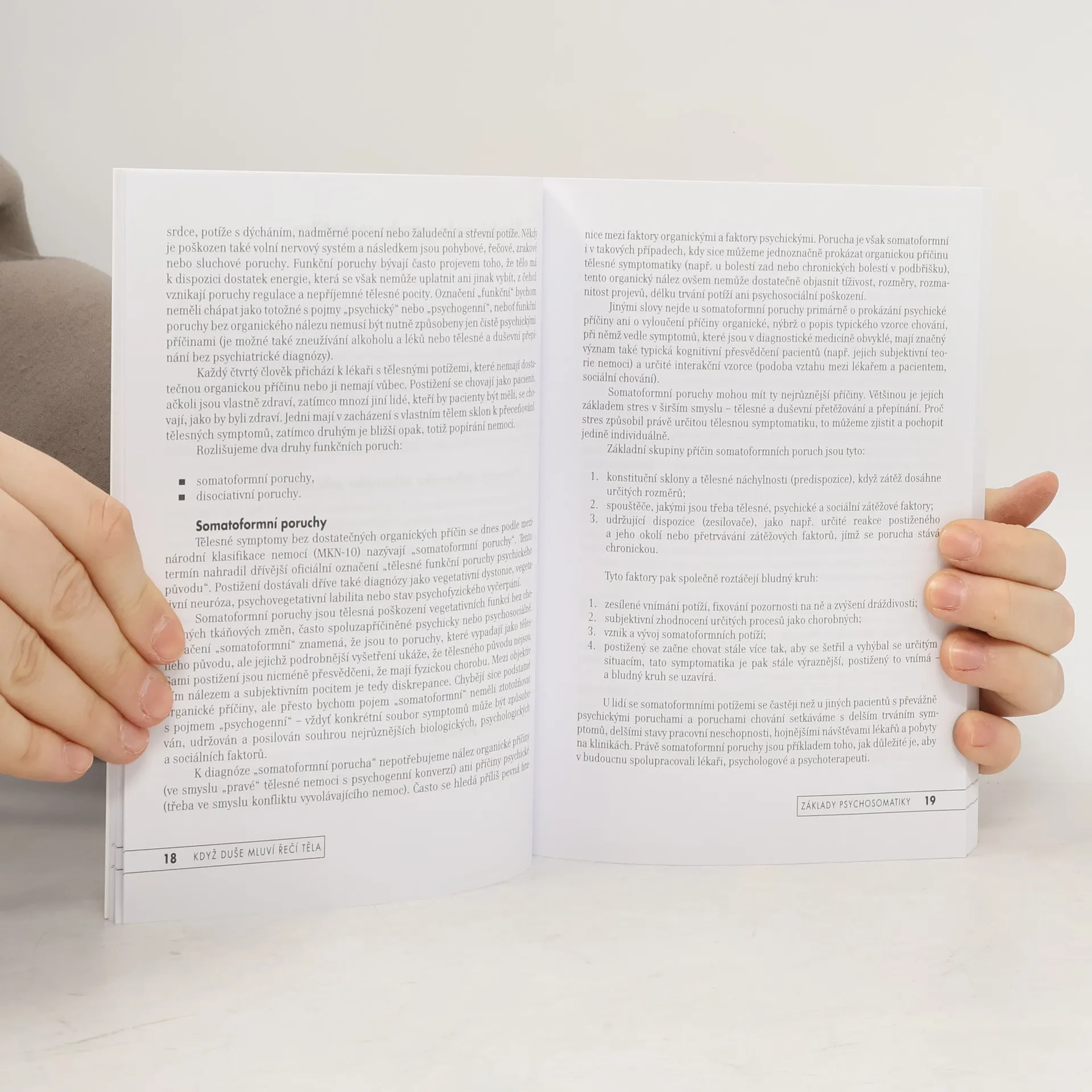 Populární a přitom seriózní přehled psychosomatiky zahrnuje všechny důležité orgány a jejich nejčastější psychosomatická onemocnění. Po krátkém úvodu, který se zabývá dějinami a vymezením psychosomatiky, se autoři soustřeďují na tělesné poruchy bez zjevných organických příčin (somatoformní a disociativní poruchy) a na tělesné poruchy s psychologickými faktory (psychosomatické poruchy v užším smyslu). Popisují řadu somatoformních a psychosomatických poruch podle různých orgánových oblastí - srdce, krevní tlak, dýchání, žaludek, střeva, kůže, ženské orgány, uši, krk, nos, hlas, oči, zuby, pohybové ústrojí. Součástí každé kapitoly jsou kromě kazuistické demonstrace také psychosomatické koncepty, dotýkající se jak psychologických faktorů dané oblasti, tak praktických terapeutických postupů. Také jako e-kniha