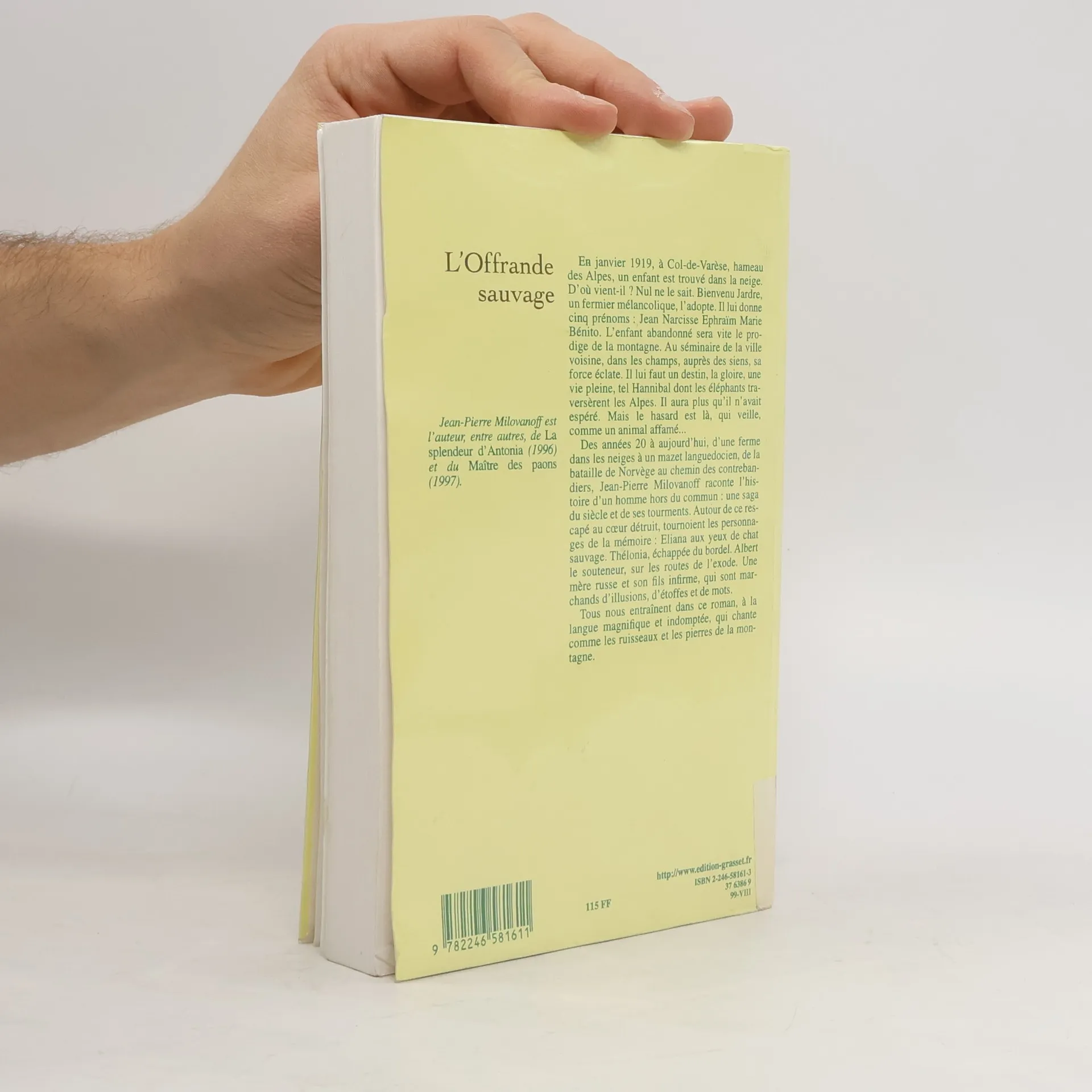 En janvier 1919, à Col-de-Varèse, hameau des Alpes, un enfant est trouvé dans la neige. D'où vient-il ? Nul ne le sait. Bienvenu Jardre, un fermier mélancolique, l'adopte. Il lui donne cinq prénoms : Jean Narcisse Ephraïm Marie Bénito. L'enfant abandonné sera vite le prodige de la montagne. Au séminaire de la ville voisine, dans les champs, auprès des siens, sa force éclate. Il lui faut un destin, la gloire, une vie pleine, tel Hannibal ont les éléphants traversèrent les Alpes. Il aura plus qu'il n'avait espéré. Mais le hasard est là, qui veille, comme un animal affamé... Des années 20 à aujourd'hui, d'une ferme dans les neiges à un mazet languedocien, de la bataille de Norvège au chemin des contrebandiers, Jean-Pierre Milovanoff raconte l'histoire d'un homme héros du commun : une saga du siècle des tourments. Autour de ce rescapé au cœur détruit, tournoient les personnages de la mémoire : Eliana aux yeux de chat sauvage. Thélonia, échappée du bordel. Albert le souteneur, sur les routes de l'exode. Une mère russe et son fils infirme, qui sont marchands d'illusions, d'étoffes et de mots. Tous nous entraînent dans ce roman, à la langue magnifique et indomptée, qui chante comme les ruisseaux et les pierres de la montagne.