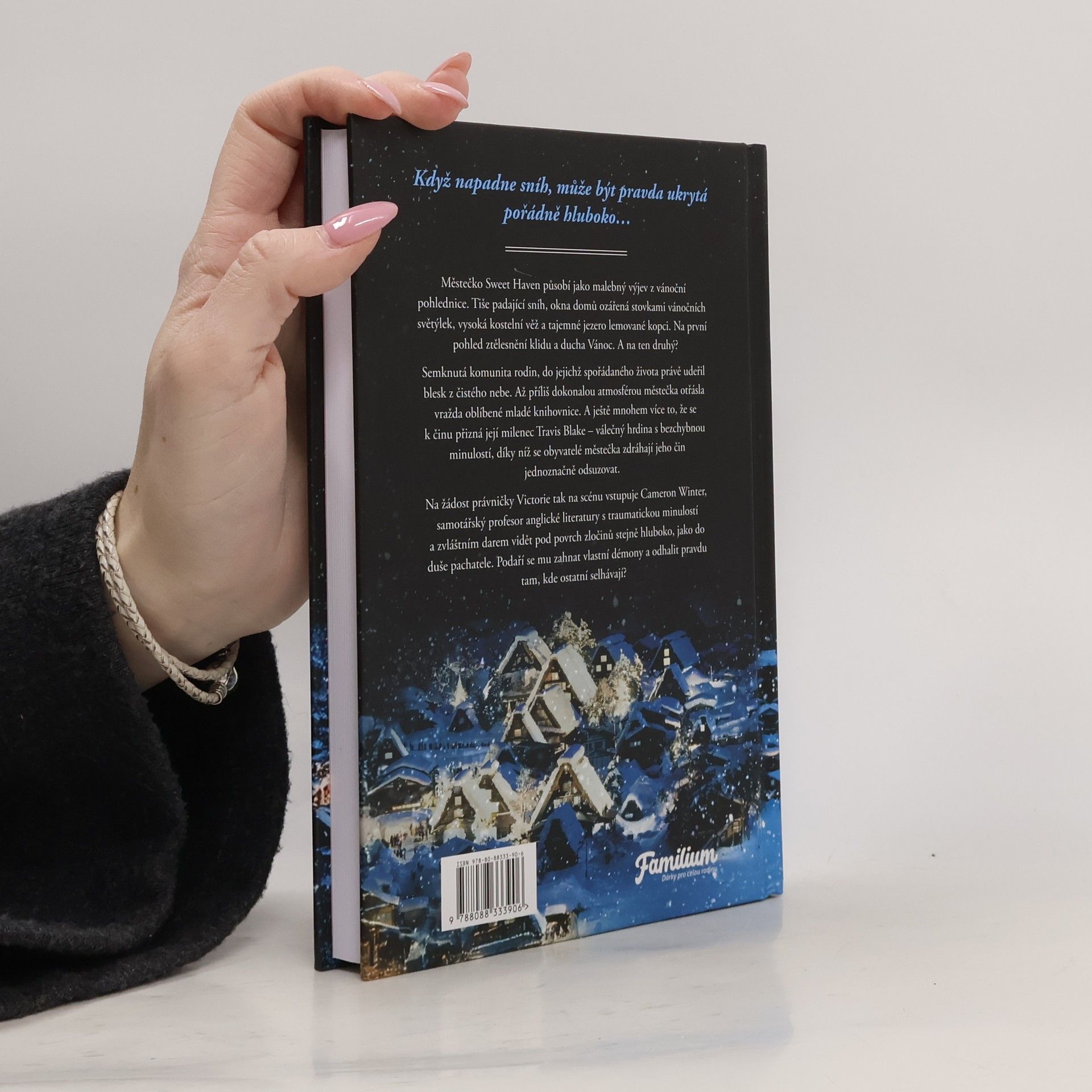 Zasněžené městečko skrývá příběh, který měl navždy zůstat tajemstvím. Městečko Sweet Haven působí jako malebný výjev z vánoční pohlednice. Tiše padající sníh, okna domů ozářená stovkami vánočních světýlek, vysoká kostelní věž a tajemné jezero lemované kopci. Na první pohled ztělesnění klidu a ducha Vánoc. A na ten druhý? Semknutá komunita rodin, do jejichž spořádaného života právě udeřil blesk z čistého nebe. Až příliš dokonalou atmosférou městečka otřásla vražda oblíbené mladé knihovnice. A ještě mnohem více to, že se k činu přizná její milenec Travis Blake –? válečný hrdina s bezchybnou minulostí, díky níž se obyvatelé městečka zdráhají jeho čin jednoznačně odsuzovat. Na žádost právničky Victorie tak na scénu vstupuje Cameron Winter, samotářský profesor anglické literatury s traumatickou minulostí a zvláštním darem vidět pod povrch zločinů stejně hluboko, jako do duše pachatele. Podaří se mu zahnat vlastní démony a odhalit pravdu tam, kde ostatní selhávají?