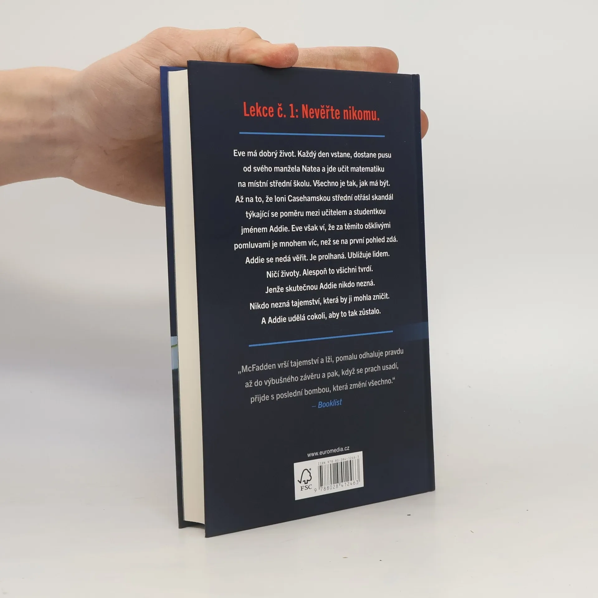 Eve má dobrý život. Každý den vstane, dostane pusu od svého manžela Natea a jde učit matematiku na místní střední školu. Všechno je tak, jak má být. Až na to, že loni casehamskou střední otřásl skandál týkající se poměru mezi učitelem a studentkou jménem Addie. Eve však ví, že za těmito ošklivými pomluvami je mnohem víc, než se na první pohled zdá. Addie se nedá věřit. Je prolhaná. Ubližuje lidem. Ničí životy. Alespoň to všichni tvrdí. Jenže skutečnou Addie nikdo nezná. Nikdo nezná tajemství, která by ji mohla zničit. A Addie udělá cokoli, aby to tak zůstalo.