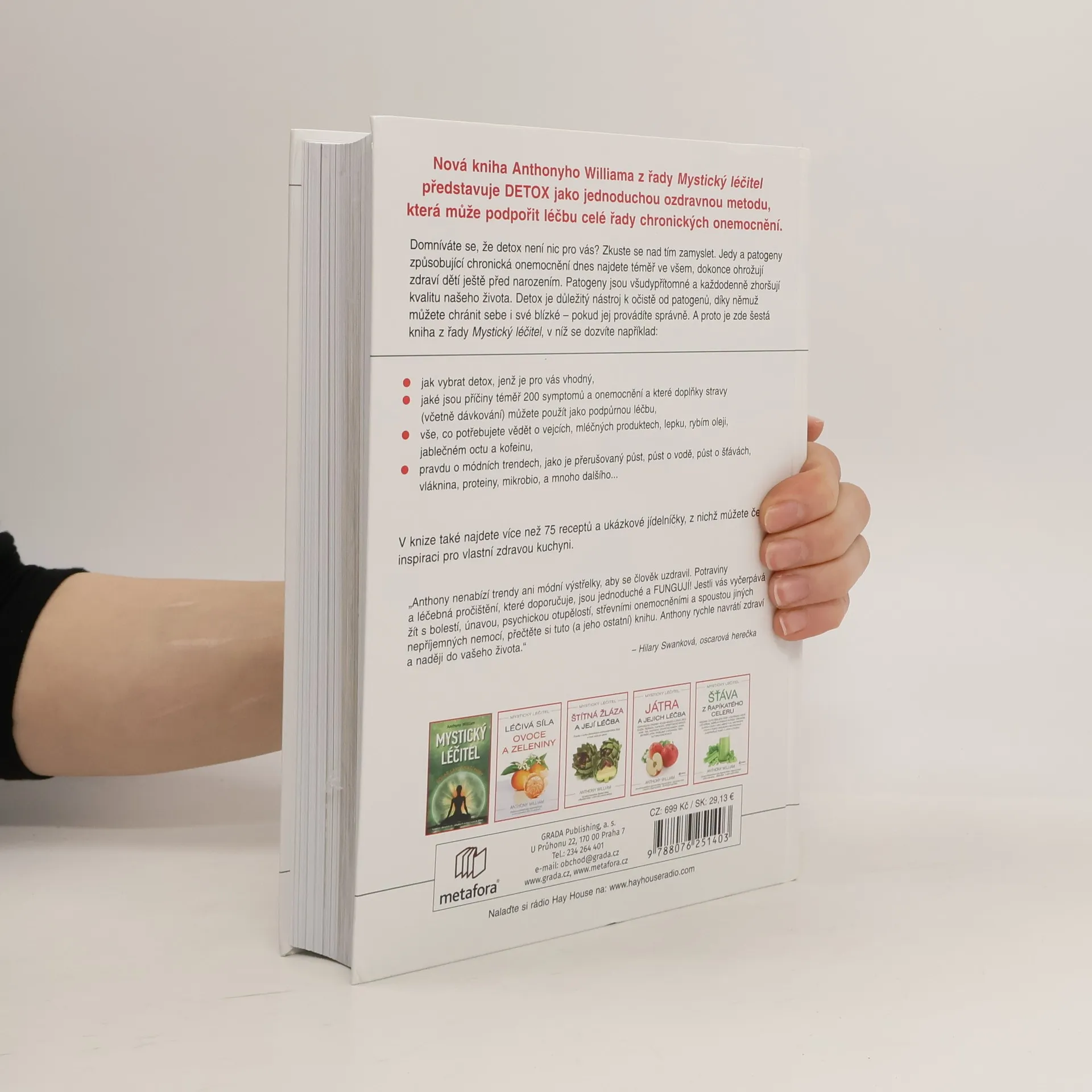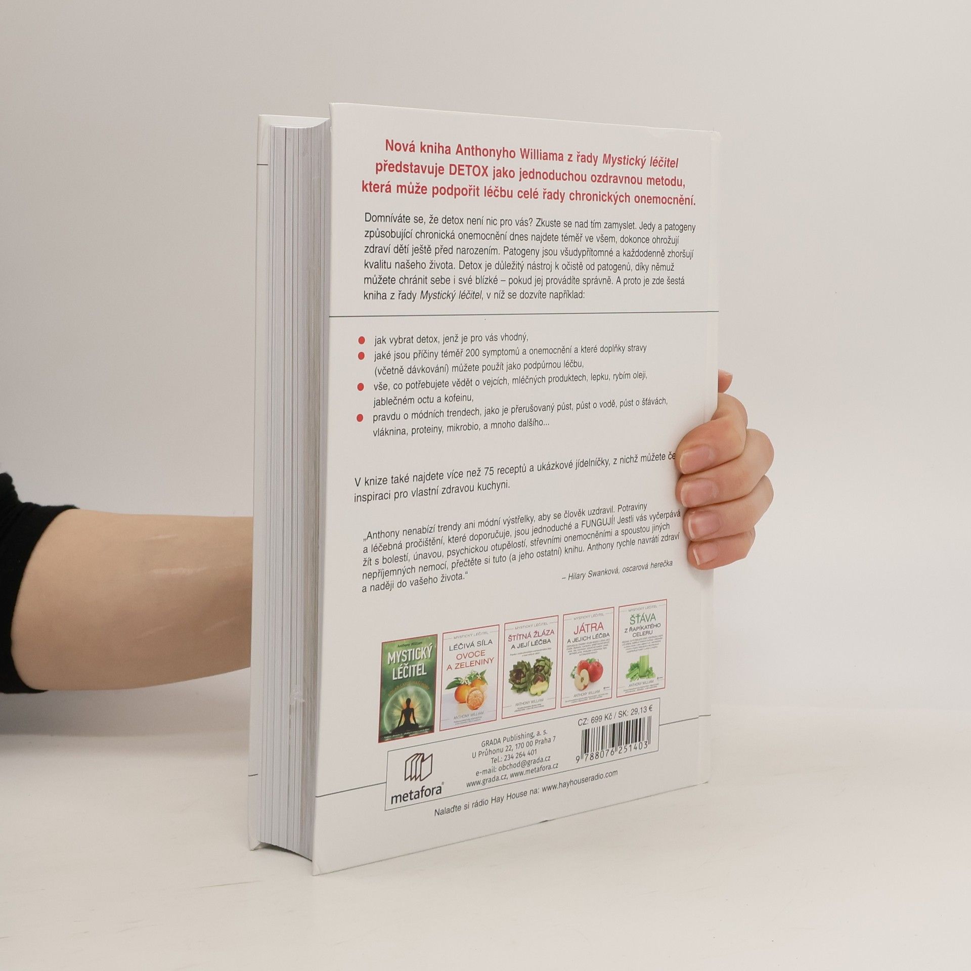 Nová kniha Anthonyho Williama z řady Mystický léčitel představuje DETOX jako jednoduchou ozdravnou metodu, která může podpořit léčbu celé řady chronických onemocnění. Domníváte se, že detox není nic pro vás? Zkuste se nad tím zamyslet. Jedy a patogeny způsobující chronická onemocnění dnes najdete téměř ve všem, dokonce ohrožují zdraví dětí ještě před narozením. Patogeny jsou všudypřítomné a každodenně zhoršují kvalitu našeho života. Detox je důležitý nástroj k očistě od patogenů, díky němuž můžete chránit sebe i své blízké – pokud jej provádíte správně. A proto je zde šestá kniha z řady Mystický léčitel, v níž se dozvíte například: jak vybrat postup, jenž je pro vás vhodný, jaké jsou příčiny téměř 200 symptomů a onemocnění a které doplňky stravy (včetně dávkování) můžete použít jako podpůrnou léčbu, vše, co potřebujete vědět o vejcích, mléčných produktech, lepku, rybím oleji, jablečném octu a kofeinu, pravdu o módních trendech, jako je přerušovaný půst, půst o vodě, půst o šťávách, vláknina, proteiny, mikrobiom a další V knize také najdete více než 75 receptů a ukázkové jídelníčky, z nich můžete čerpat inspiraci.