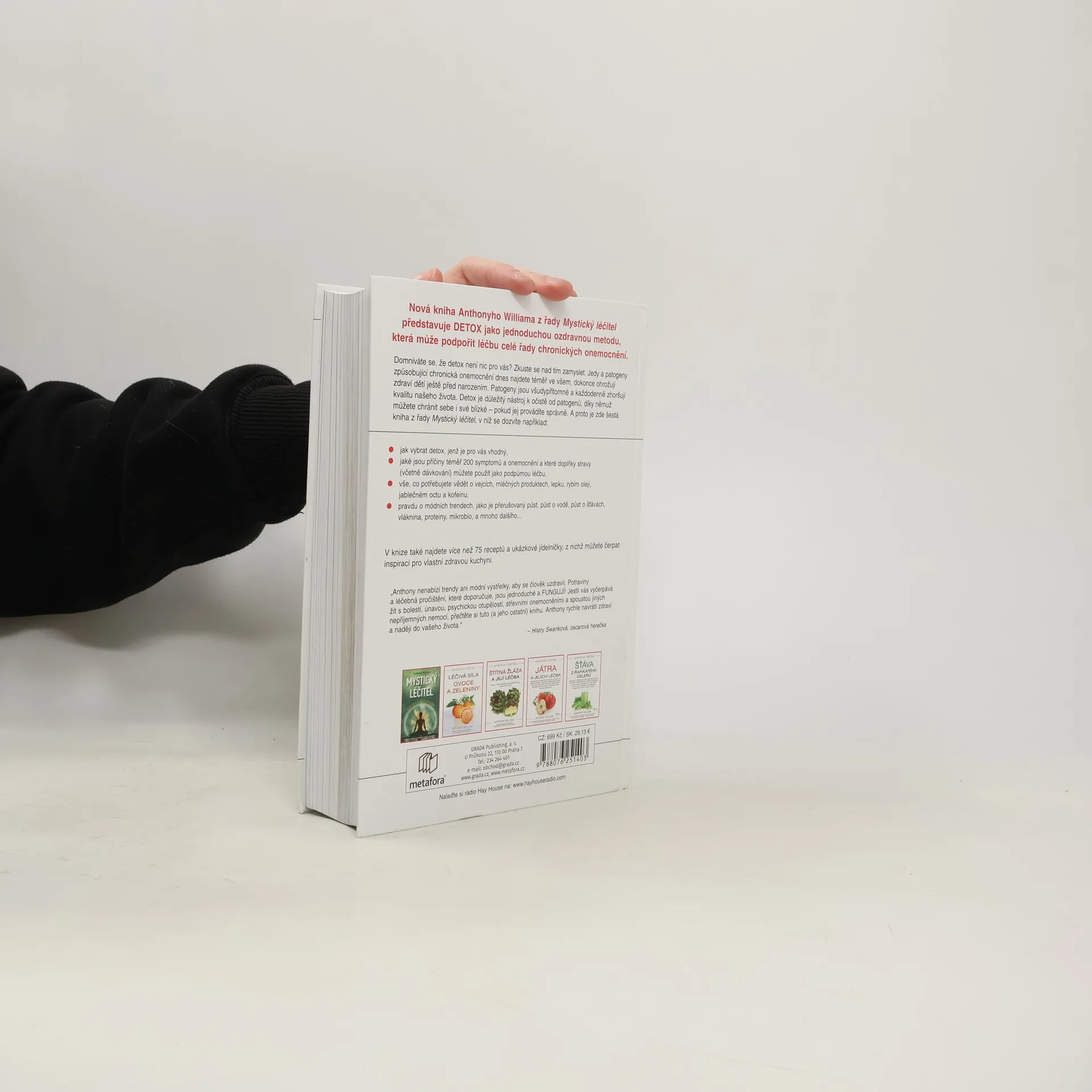 Nová kniha Anthonyho Williama z řady Mystický léčitel představuje DETOX jako jednoduchou ozdravnou metodu, která může podpořit léčbu celé řady chronických onemocnění. Domníváte se, že detox není nic pro vás? Zkuste se nad tím zamyslet. Jedy a patogeny způsobující chronická onemocnění dnes najdete téměř ve všem, dokonce ohrožují zdraví dětí ještě před narozením. Patogeny jsou všudypřítomné a každodenně zhoršují kvalitu našeho života. Detox je důležitý nástroj k očistě od patogenů, díky němuž můžete chránit sebe i své blízké – pokud jej provádíte správně. A proto je zde šestá kniha z řady Mystický léčitel, v níž se dozvíte například: jak vybrat postup, jenž je pro vás vhodný, jaké jsou příčiny téměř 200 symptomů a onemocnění a které doplňky stravy (včetně dávkování) můžete použít jako podpůrnou léčbu, vše, co potřebujete vědět o vejcích, mléčných produktech, lepku, rybím oleji, jablečném octu a kofeinu, pravdu o módních trendech, jako je přerušovaný půst, půst o vodě, půst o šťávách, vláknina, proteiny, mikrobiom a další V knize také najdete více než 75 receptů a ukázkové jídelníčky, z nich můžete čerpat inspiraci.