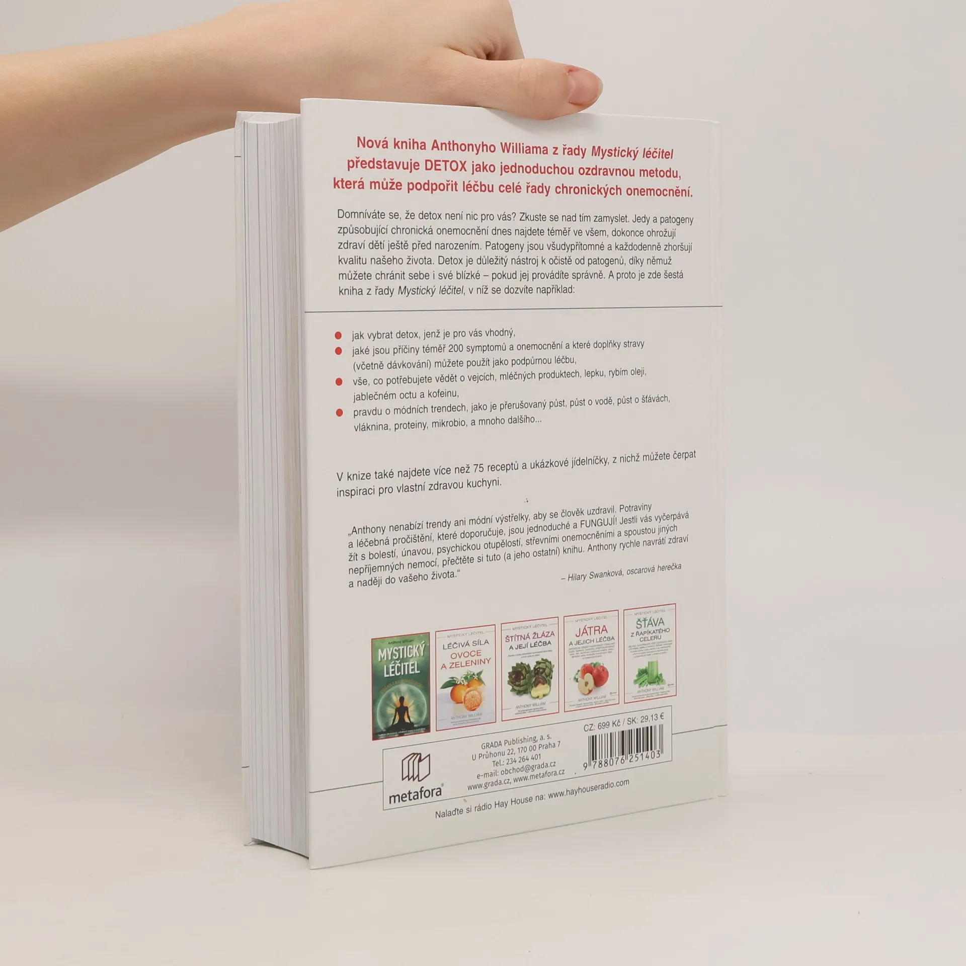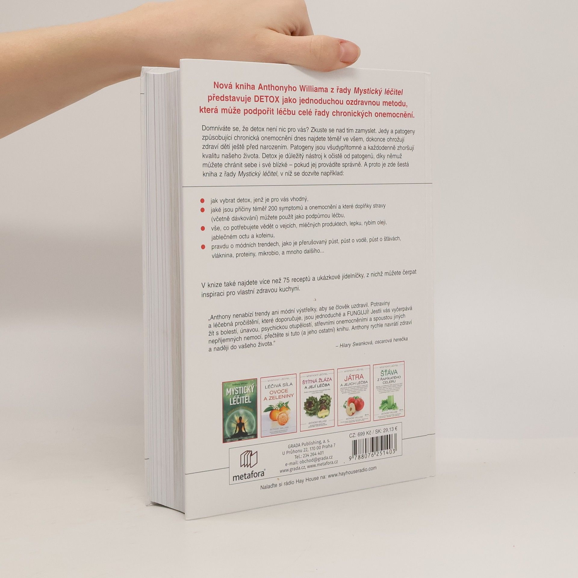 Nová kniha Anthonyho Williama z řady Mystický léčitel představuje DETOX jako jednoduchou ozdravnou metodu, která může podpořit léčbu celé řady chronických onemocnění. Domníváte se, že detox není nic pro vás? Zkuste se nad tím zamyslet. Jedy a patogeny způsobující chronická onemocnění dnes najdete téměř ve všem, dokonce ohrožují zdraví dětí ještě před narozením. Patogeny jsou všudypřítomné a každodenně zhoršují kvalitu našeho života. Detox je důležitý nástroj k očistě od patogenů, díky němuž můžete chránit sebe i své blízké – pokud jej provádíte správně. A proto je zde šestá kniha z řady Mystický léčitel, v níž se dozvíte například: jak vybrat postup, jenž je pro vás vhodný, jaké jsou příčiny téměř 200 symptomů a onemocnění a které doplňky stravy (včetně dávkování) můžete použít jako podpůrnou léčbu, vše, co potřebujete vědět o vejcích, mléčných produktech, lepku, rybím oleji, jablečném octu a kofeinu, pravdu o módních trendech, jako je přerušovaný půst, půst o vodě, půst o šťávách, vláknina, proteiny, mikrobiom a další V knize také najdete více než 75 receptů a ukázkové jídelníčky, z nich můžete čerpat inspiraci.