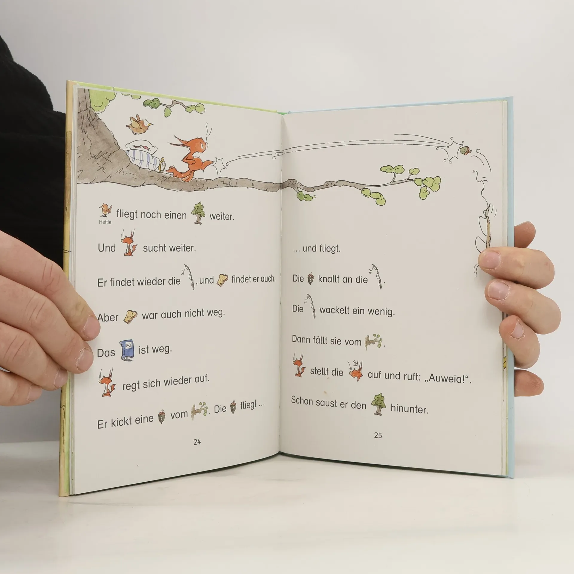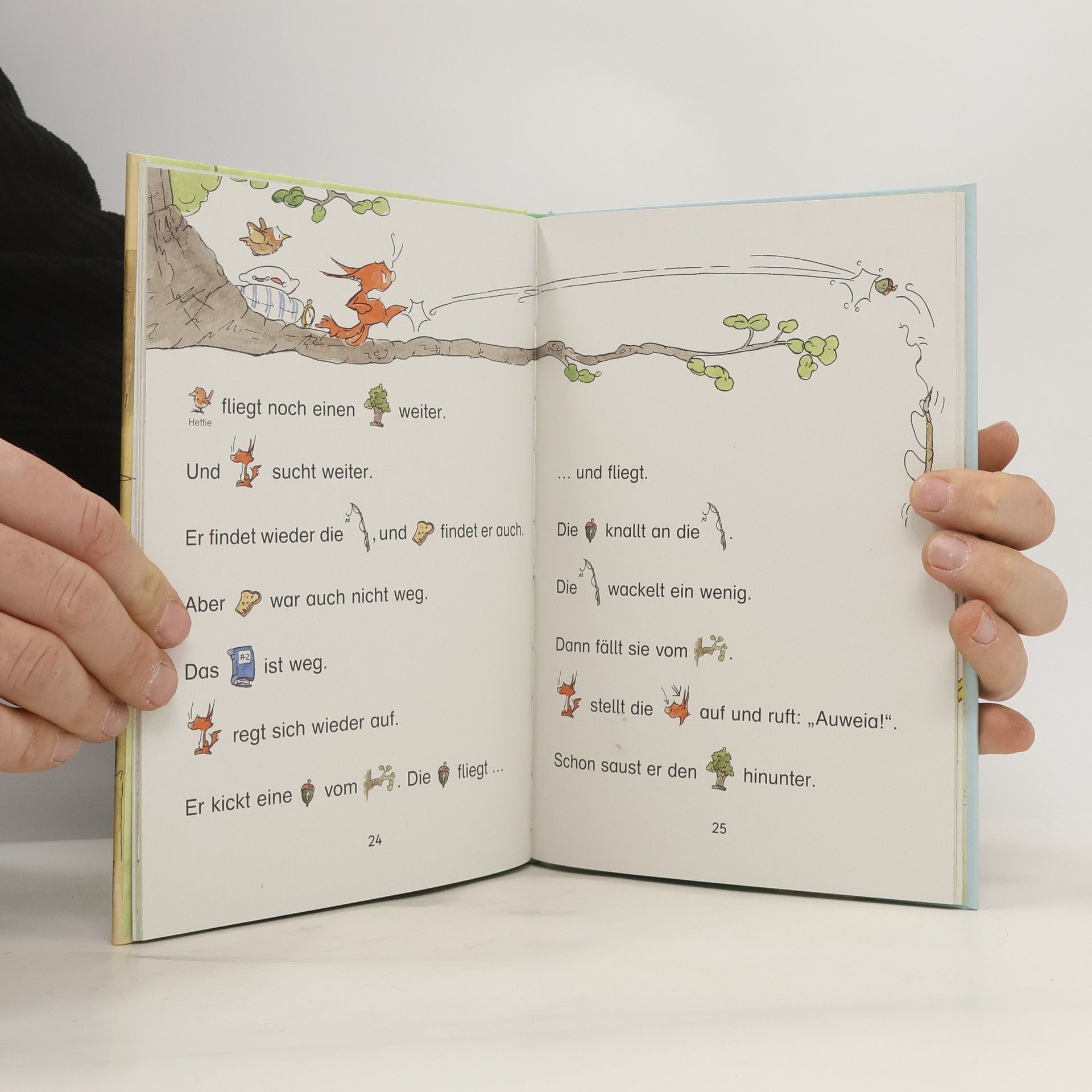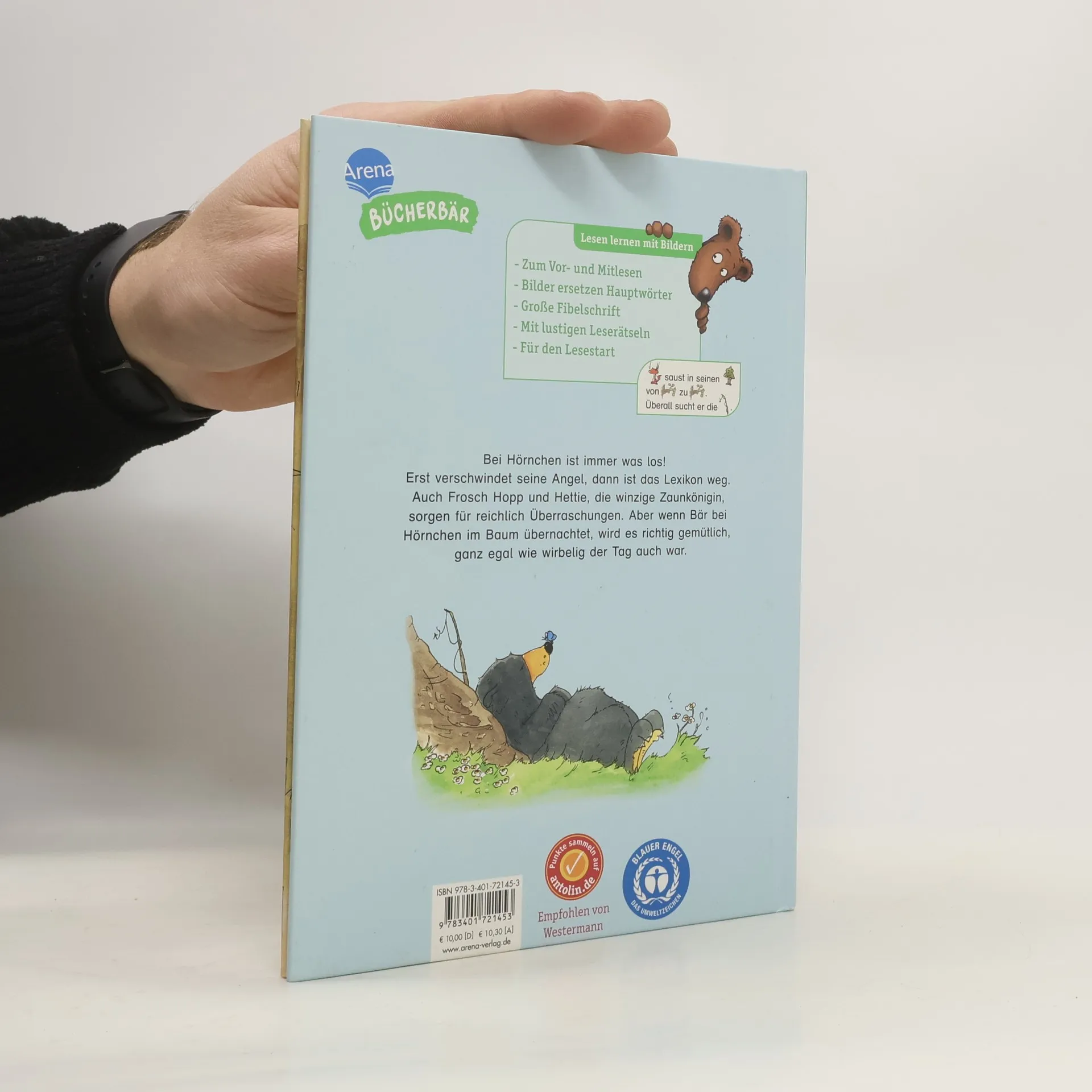 Eine Geschichte zum Lesenlernen , zum Vor- und Mitlesen für Kinder ab 5 Jahren Die Arena Leselern-Garantie – das macht Vorschulkindern Spaß Hörnchen hat es nicht leicht! Ständig passieren seltsame Dinge auf seinem Baum: Erst verschwindet seine Angel, dann ist das Lexikon weg. Auch Hopp und Hettie, die winzige Zaunkönigin, sind nicht immer die besten Baum-Mitbewohner. Und wenn Bär bei ihm im Baum übernachtet, ist Hörnchen ganz besonders aufgeregt. Wie gut, dass Bär ihn so gut versteht. Dann ist alles gar nicht mehr so schlimm. • Bilder ersetzen Hauptwörter • Kinder, die das Abc noch nicht gelernt haben, können mitlesen • Rätsel am Ende des Buches • Rätsel und Mitlesen steigern die Neugier und machen Lust auf mehr Gedruckt auf Umweltpapier und zertifiziert mit dem „ Blauen Engel “ Der Titel ist auf Antolin.de gelistet Weitere Bücherbär-Geschichten zum Vor- und Mitlesen: 978-3-401-71788-3 Fußballfreunde sind unschlagbar 978-3-401-71571-1 Der kleine Pirat und das Geheimnis des Riesenkraken 978-3-401-71666-4 In Papas Autowerkstatt ist was los! 978-3-401-71648-0 Ferdinand, der kleine Feuerwehrmann 978-3-401-72071-5 Polizist Leon im Einsatz 978-3-401-71649-7 Juli Löwenzahn. Zwei Freunde und das größte Abenteuer der Welt 978-3-401-71670-1 Erdbeerinchen Erdbeerfee. Ein geheimnisvolles Geschenk 978-3-401-71690-9 Lilia, die kleine Elbenprinzessin. Das verzauberte Einhorn 978-3-401-71669-5 Drache Neo und die Kraft der Feuerbohnen 978-3-401-71912-2Max im Land der Dinosaurier 978-3-401-71911-5 Pepe, das kleine Zauberpony 978-3-401-72071-5 Nur Mut, Emma Eule! 978-3-401-72067-8 Das kleine Muffelmonster und der Saure-Gurken-Dieb